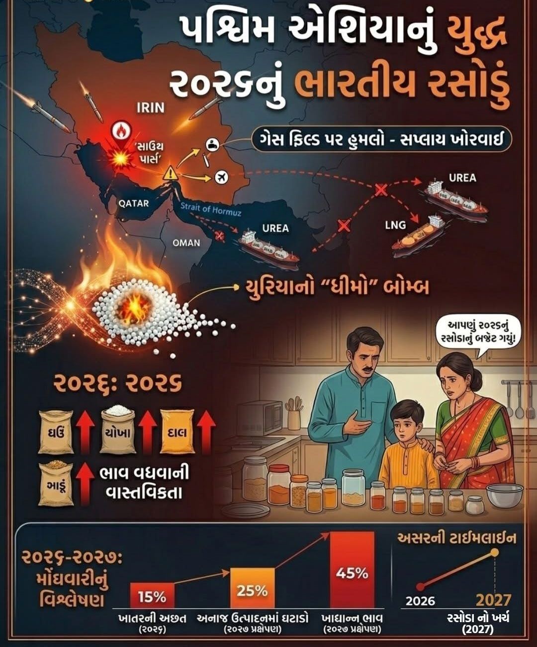 દુનિયાની નજર અત્યારે પશ્ચિમ એશિયામાં વરસી રહેલી મિસાઇલો પર છે. આપણને લાગે છે કે યુદ્ધ ત્યાં દૂર ક્યાંક રણની ધરતી પર લડાઈ રહ્યું છે. પણ સાવધાન! આ યુદ્ધની એક એવી આગ છે જે દેખાતી નથી, પણ તે ધીમે ધીમે તમારી થાળી સુધી પહોંચી રહી છે. આ આગ તેલ કે ગેસની નથી, આ આગ છે ‘યુરિયા’ની. જ્યારે મિસાઇલોના વિસ્ફોટો બંધ થશે, ત્યારે મોંઘવારીનો આ ‘યુરિયા બોમ્બ’ ફાટશે અને તેની સીધી અસર ભારત જેવા દેશના મધ્યમ વર્ગના રસોડાના બજેટ પર પડશે.