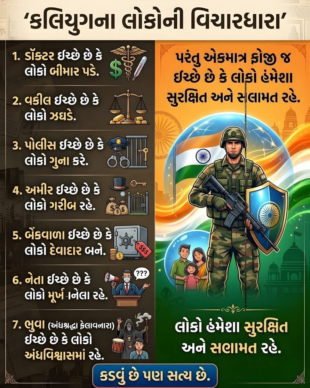 આ વાત કદાચ સાંભળવામાં કડવી લાગે, પણ આજના ભૌતિકવાદી સમાજનું આ નગ્ન સત્ય છે. જ્યારે દરેક વ્યક્તિ ‘મારું શું?’ એ વિચારમાં અટવાયેલી છે, ત્યારે સૈનિક ‘મારા દેશનું શું?’ એ વિચારીને જીવે છે.