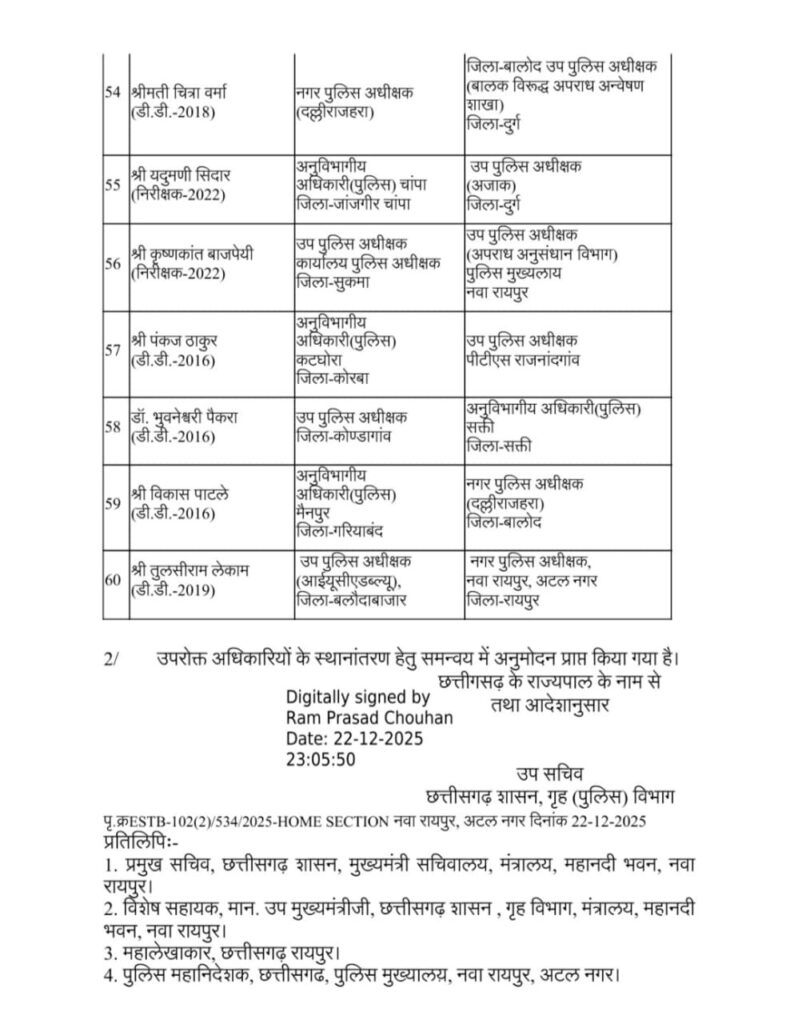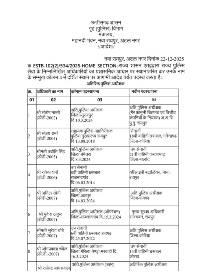 छत्तीसगढ़ शासन के गृह विभाग ने कल प्रदेश में थोक के भाव में पुलिस महकमे में तबादला आदेश जारी किया है जिसमें विधानसभा अध्यक्ष का जिला भी प्रभावित हुआ है पढ़िए कौन कहां