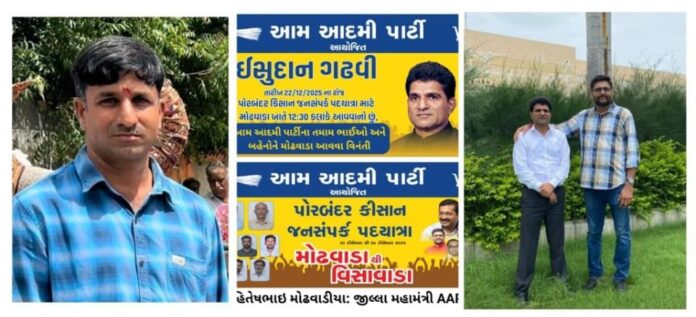 ગુજરાતમાં ખેડૂતોના પ્રશ્નો, ગ્રામ્ય વિકાસ અને લોકહિતના મુદ્દાઓને કેન્દ્રમાં રાખીને આમ આદમી પાર્ટી દ્વારા પોરબંદર જિલ્લામાં ‘કિસાન જનસંપર્ક પદયાત્રા’નું આયોજન કરવામાં આવ્યું છે. મોઢવાડાથી લીરબાઈ માતાના આશીર્વાદ મેળવીને વિસાવાડાના શ્રીકૃષ્ણ ચરણ સુધી નીકળનારી આ પદયાત્રાનો પ્રારંભ તા.૨૨/૧૨/૨૦૨૫ના રોજ બપોરે ૧૨:૩૦ કલાકે આમ આદમી પાર્ટીના ગુજરાત પ્રદેશ અધ્યક્ષ ઈસુદાનભાઈ ગઢવીના હસ્તે મોઢવાડાથી કરવામાં આવશે.