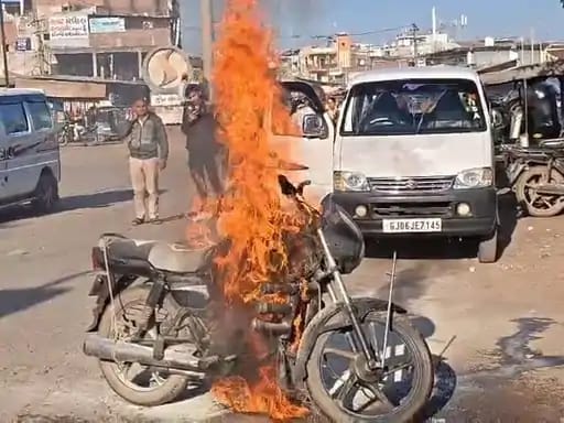 ભરૂચ જિલ્લાના જંબુસર શહેરના વ્યસ્ત ડેપો સર્કલ વિસ્તારમાં એક ચાલતી મોટરસાઇકલમાં અચાનક આગ લાગવાની ઘટના બની હતી, જેના કારણે માર્ગ પર અફરાતફરી સર્જાઈ ગઈ હતી.ચાલતી બાઇકમાંથી અચાનક ધુમાડો નીકળ્યા બાદ ગણતરીની ક્ષણોમાં જ આગ ભભૂકી ઊઠી હતી. વાહનચાલકે તાત્કાલિક બાઇકને રસ્તાની બાજુએ ઊભું રાખીને પોતાનો જીવ બચાવ્યો હતો.