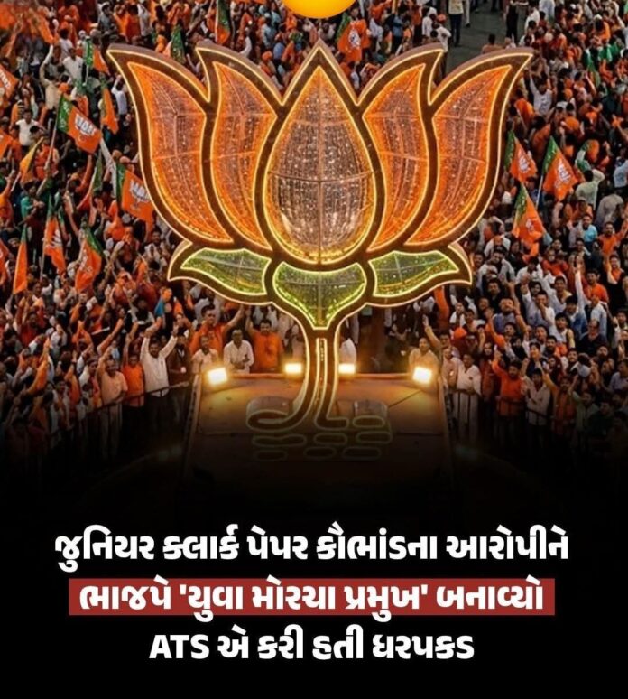 મોડાસા/અમદાવાદ: ગુજરાત સરકારની આબરૂના ધજાગરા કરનાર જુનિયર ક્લાર્ક પેપર લીક કાંડ હજુ લોકો ભૂલ્યા નથી, ત્યાં જ એક એવો રાજકીય નિર્ણય સામે આવ્યો છે જેણે સરકારની ‘ઝીરો ટોલરન્સ’ નીતિ પર સવાલો ઉભા કર્યા છે. વર્ષ 2023ના કરોડોના પેપર લીક કૌભાંડમાં જેનું નામ ગાજ્યું હતું અને જેની ગુજરાત એટીએસ (ATS) દ્વારા ધરપકડ કરવામાં આવી હતી, તે આકાશ જશુભાઈ પટેલને ભાજપ દ્વારા અરવલ્લી જિલ્લા યુવા મોરચાના પ્રમુખ બનાવવામાં આવતા રાજકીય ગરમાવો આવી ગયો છે.