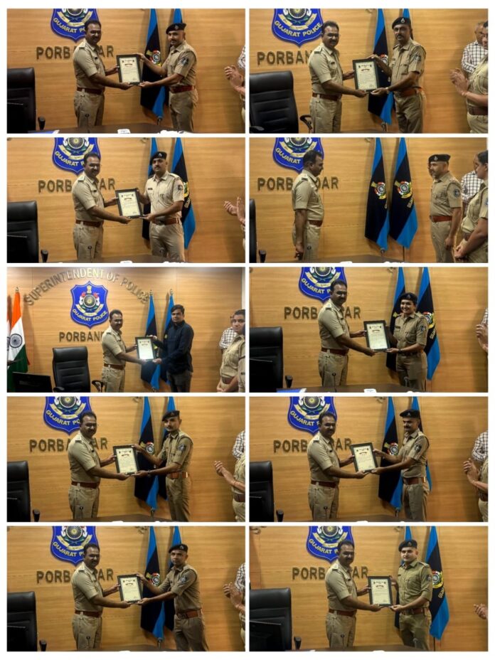 પોરબંદર જિલ્લામાં કાયદો અને વ્યવસ્થા વધુ સુદ્રઢ બનાવવા સારૂ જિલ્લા પોલીસ વડા ભગીરથસિંહ જાડેજા ના અધ્યક્ષ સ્થાને ક્રાઇમ કોન્ફરન્સ યોજવામાં આવી હતી. તેમજ માહે નવેમ્બર ૨૦૨૫ માસ ની પોરબંદર જિલ્લા માં ફરજ બજાવતા અધિકારી અને કર્મચારીઓએ વિશિષ્ટ સેવા અને પ્રશંસનીય કામગીરી કરવા બદલ સાયબર ક્રાઈમ, એલ.સી.બી., એસ. ઓ. જી ,પેરોલ ફર્લો તેમજ કીર્તિ મંદિર પોલીસ સ્ટેશન સહિત ના ૧૧ પોલીસ કર્મચારીઓને જિલ્લા પોલીસ વડા દ્વારા પ્રશંસા પત્ર એનાયત કરી બીરદાવામાં આવ્યા હતા.