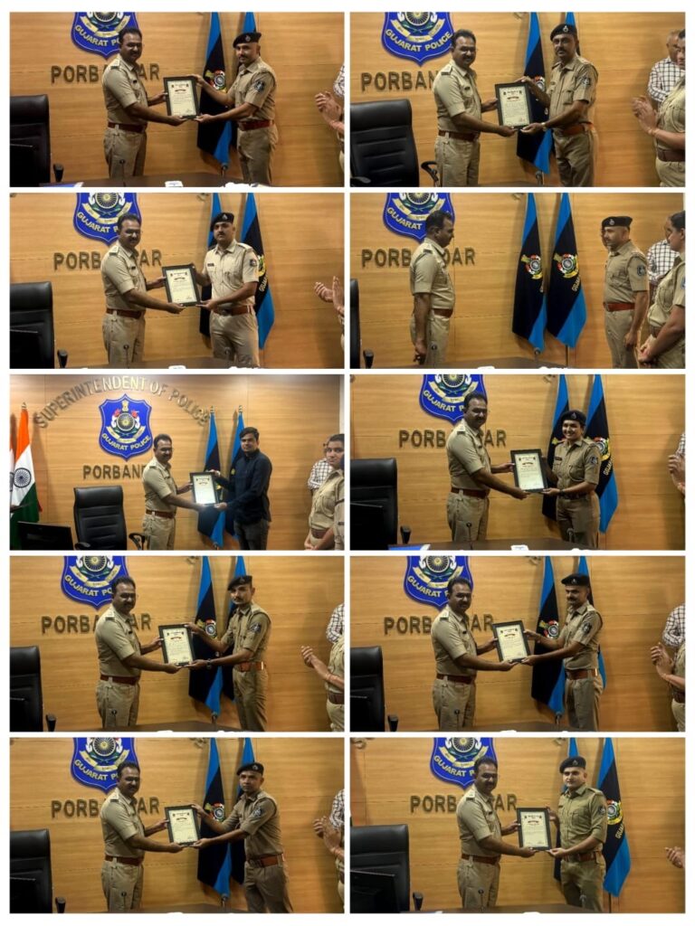 પેરોલ ફર્લો પો.હેડ.કોન્સ. પીયુષભાઇ રણમલભાઇ સિસોદીયા દ્વારા રાણાવાવ પો.સ્ટે. ના ૧૬ વર્ષ થી ગેઝેટ પ્રસિધ્ધ નાસતા ફરતા આરોપીને મધ્યપ્રદેશ અલીરાજપુર ખાતેથી શોધી કાઢી પ્રસંશનીય કામગીરી કરેલ છે. અને કીર્તિમંદીર પોલીસ સ્ટેશનના એ.એસ.આઇ. ચાંડપા ભરતભાઇ સોમજીભાઇ દ્વારા કીર્તિમંદીર પો.સ્ટે. વિસ્તાર ના લકડી બંદર પુલ સામે થી એક ઇસમને શંકાના આધારે ચોરીના બે મોટર સાયકલો સાથે પકડી પાડી બી.એન.એસ.એસ. ક. ૩૫(૧) (ઇ), ૧૦૬ મુજબની કાર્યવાહી કરી પ્રસંશનીય કામગીરી કરેલ છે આમ પોલીસ જિલ્લામાંથી પ્રસંશનીય કામગીરી કરનાર ૧૧ પોલીસ અધિકારી અને કર્મચારીઓ ને પોરબંદર જિલ્લા પોલીસ અધિક્ષક ભગીરથસિંહ જાડેજાનાઓએ પ્રોત્સાહન રૂપે પ્રશંસાપ્રત્ર એનાયત કરી બિરદાવવામાં આવ્યા હતા.