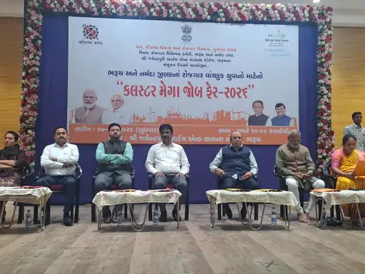 ગુજરાત સરકારના શ્રમ અને રોજગાર વિભાગ દ્વારા ભરૂચની જયેન્દ્રપુરી આર્ટસ એન્ડ સાયન્સ કોલેજ ખાતે ભરૂચ અને નર્મદા જિલ્લાના યુવાનો માટે ‘ક્લસ્ટર મેગા જોબફેર’નું ભવ્ય આયોજન કરવામાં આવ્યું હતું. આ રોજગાર મેળામાં રિલાયન્સ, એસઆરએફ, સનફાર્મા અને એમઆરએફ જેવી ૪૪ જેટલી નામાંકિત કંપનીઓએ ઉપસ્થિત રહી ૨૩૮૧ વિવિધ જગ્યાઓ માટે ભરતી પ્રક્રિયા હાથ ધરી હતી, જેમાં મોટી સંખ્યામાં શૈક્ષણિક લાયકાત ધરાવતા યુવક-યુવતીઓ ઉમટી પડ્યા હતા.