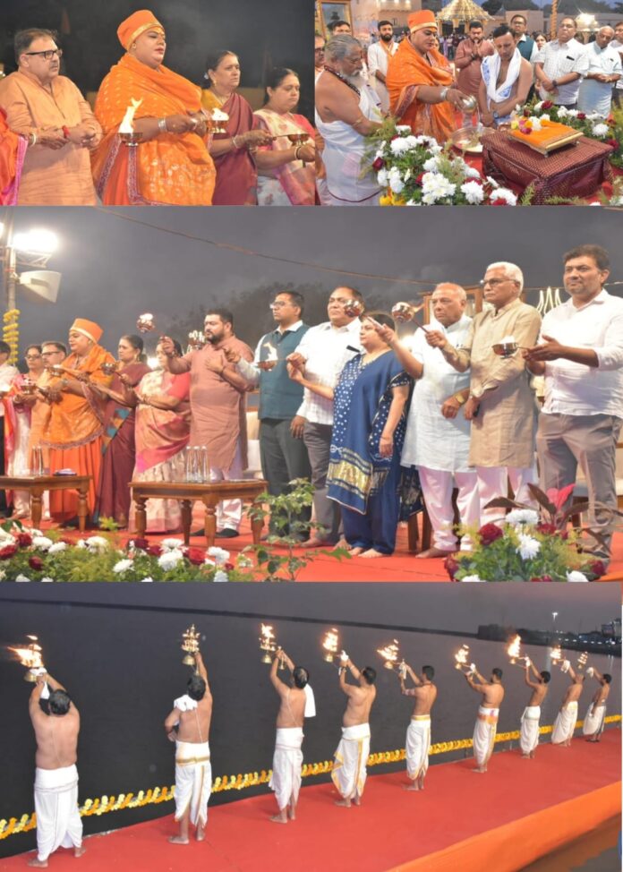 ભારતની અડગ આસ્થા, સાહસ અને સ્વાભિમાનનું પ્રતિક એવા પ્રથમ જ્યોતિર્લિંગના આંગણે મહાશિવરાત્રિની પૂર્વ સંધ્યાએ કલા અને સંસ્કૃતિના દ્વારા આરાધનાના અલૌકિક ‘સોમનાથ મહોત્સવ’ને ખૂલ્લો મૂકતાં પહેલા ઢળતી સાંજે ત્રિવેણી સંગમ ઘાટ ખાતે જિલ્લા પંચાયત પ્રમુખ શ્રી મંજૂલાબહેન મૂછાર, સાંસદ શ્રી રાજેશભાઈ ચુડાસમા સહિત મહાનુભાવોએ ‘સંગમ આરતી’ કરી હતી.