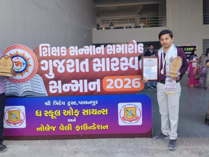 તાજેતરમાં તા:૧૧-૧-૨૦૨૬ ,રવિવારના રોજ પાલનપુર ખાતે ધ સ્કૂલ ઑફ સાયન્સ અને નોલેજ વેલી ફાઉન્ડેશન દ્વારા આયોજિત ગુજરાત સારસ્વત સન્માન ૨૦૨૬ સમારોહમાં ગુજરાત રાજ્યના શિક્ષણવિદ્ ગજેન્દ્રકુમાર જોષી , નોલેજ વેલી ફાઉન્ડેશનના ફાઉન્ડર અપૂર્વભાઈ ગુર્જર ,ધ સ્કૂલ ઑફ સાયન્સના ડાયરેક્ટર કે.પી.જોષી , પાલનપુર ( બનાસકાંઠા )ના ધારાસભ્ય અનિકેત ઠાકરની વિશેષ ઉપસ્થિતિમાં મુળ વતન સાબરકાંઠાના ચિઠોડા ગામના અને હાલ સુરેન્દ્રનગર જિલ્લાના પાટડી ની હેબતપુર પ્રાથમિક શાળામાં ધો ૧ થી ૫ માં સરકારી શિક્ષક તરીકે ફરજ બજાવતા વિષ્ણુકુમાર ડાહ્યાભાઈ પંચાલ અને તેમના પુત્ર કે જે વિરમગામમાં આનંદ માધ્યમિક શાળામાં આચાર્યની પદવી ધરાવતા ધાર્મિક વિષ્ણુભાઈ પંચાલ ( ૨૬ વર્ષ , MSc – કેમિસ્ટ્રી , BEd ) ને સારસ્વત સન્માન એવોર્ડ દ્વારા સન્માનિત કરી મોમેન્ટો , શિલ્ડ અને પ્રમાણપત્ર એનાયત કરવામા આવ્યા.ખૂબ જ નાની વયના આચાર્ય ધાર્મિક પંચાલ એક સારા લેખક પણ છે. સમસ્ત લુહાર સુથાર સમાજ પિતા -પુત્રને મળેલ આ સિધ્ધિ બદલ ખૂબ ખૂબ અભિનંદન પાઠવતા હર્ષની લાગણી સહ ગૌરવ અનુભવે છે.