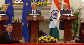 ભારત અને યૂરોપીય સંઘ વચ્ચે ઐતિહાસિક વેપાર કરારની જાહેરાત કરવામાં આવી છે. 16માં ભારત-EU શિખર સંમેલનમાં વેપાર, સુરક્ષા અને સ્વચ્છ ઉર્જાના ક્ષેત્રોમાં કરાર કરવામાં આવ્યા છે. આ સહયોગના કારણે બન્ને દેશને વિવિધ ક્ષેત્રે મજબૂતી મળશે. આજે જાહેરાત કર્યા બાદ થોડા મહિનામાં તમામ નવા નિયમો લાગૂ કરવામાં આવશે. પીએમ મોદીએ પત્રકાર પરિષદ સંબોધતા જણાવ્યુ હતુ કે, EUના નેતા પ્રથમવાર ભારતના ગણતંત્ર દિવસની ઉજવણીમાં ઉપસ્થિતિ રહ્યા છે. તે બન્ને દેશો માટે નવા અધ્યાયની શરુઆત છે.