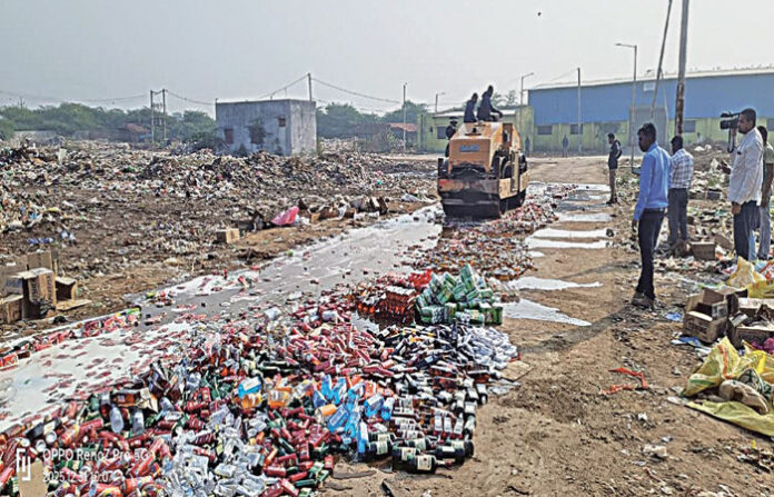 બાલાસિનોર શહેરમાં બુધવારે પોલીસ દ્વારા જુદા જુદા સાત પોલીસ મથકના પ્રોહિબિશનના ગુનામાં પકડાયેલા રૂ.૫૬.૭૮ લાખની કિંમતના દારૂનો નાશ કરવામાં આવ્યો હતો. અધિકારીઓની હાજરીમાં દારૂની બોટલોને મેદાનમાં રાખીને કાયદેસરની પ્રક્રિયા પૂર્ણ કર્યા બાદ તેના પર રોડ રોલર ફેરવી દેવામાં આવ્યું હતું.