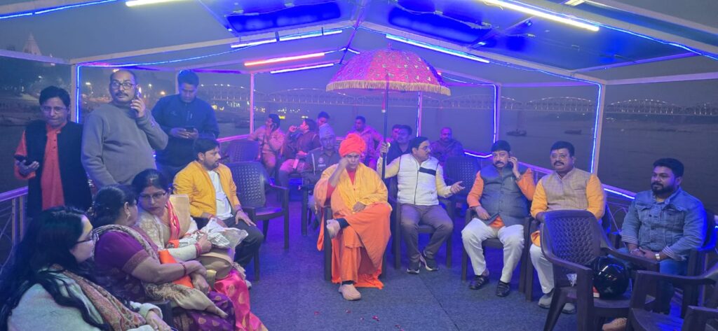 बाद में स्वामी जी ने पावन मां गंगा में नौका-विहार किया। नौका-विहार के समय उपस्थित कार्यकर्ताओं और श्रद्धालुओं ने “सनातन धर्म की जय” एवं “स्वामी चक्रपाणि जी महाराज की जय” जैसे गगनभेदी नारों से काशी की पावन धरा को गुंजायमान कर दिया। कार्यक्रम के दौरान भक्ति-भजनों का सस्वर गायन हुआ, जिसे स्वामी जी ने श्रद्धापूर्वक सुना।