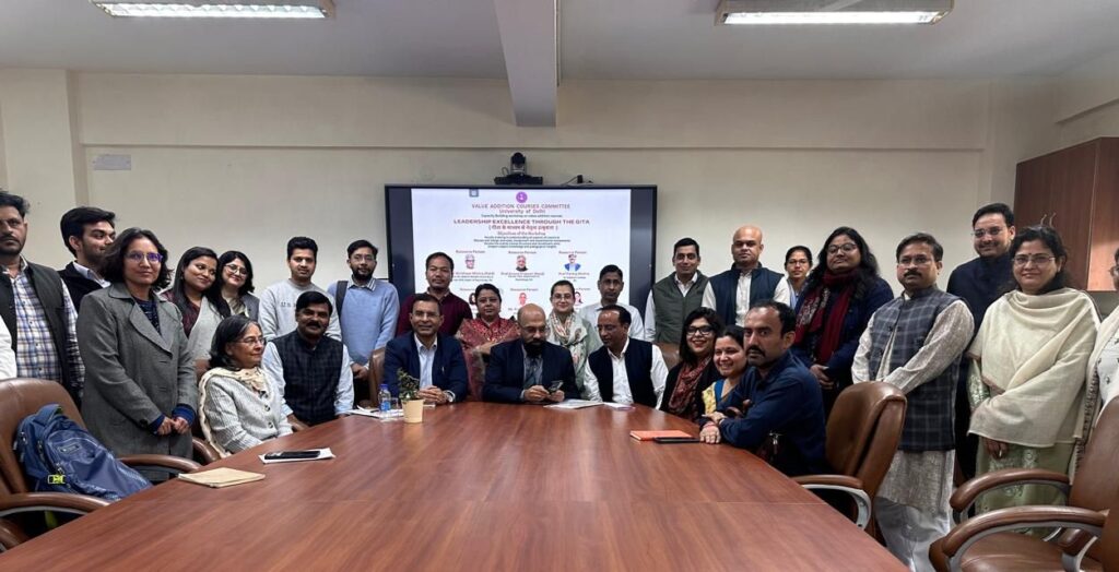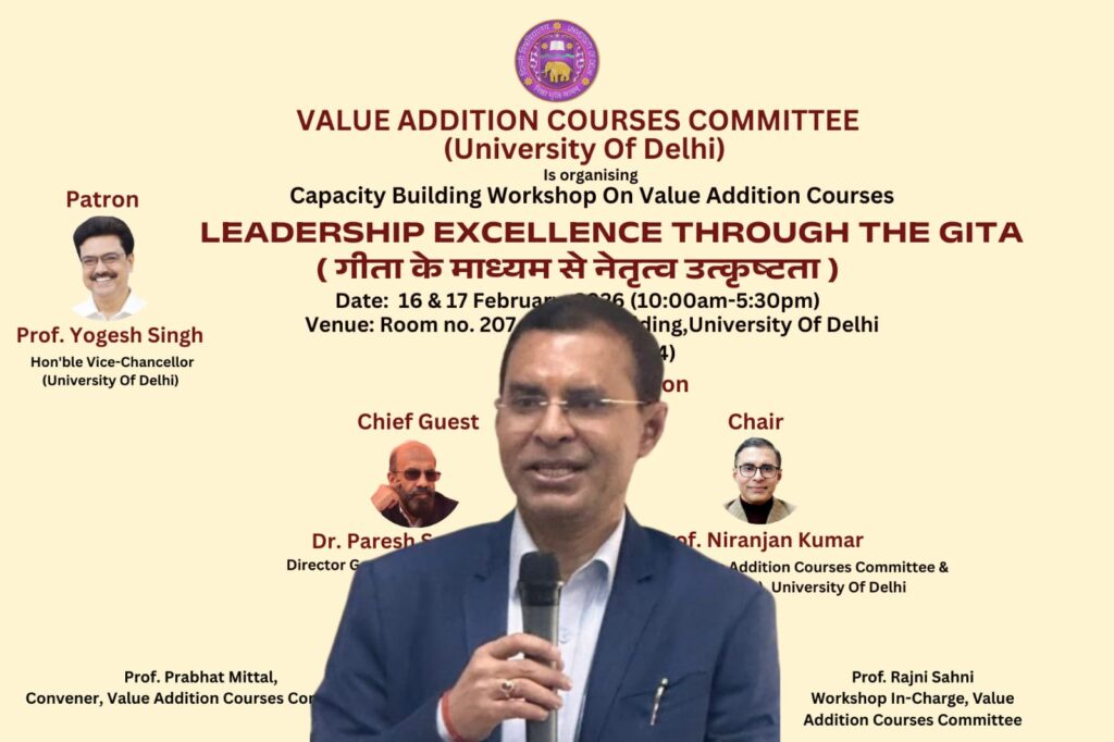 दिल्ली विश्वविद्यालय की मूल्य संवर्धन पाठ्यक्रम समिति द्वारा ‘गीता के माध्यम से नेतृत्व उत्कृष्टता’ विषय पर दो दिवसीय 16-17 फरवरी को क्षमता संवर्धन कार्यशाला (कैपिसिटी बिल्डिंग वर्कशॉप) का आयोजन किया गया। दिल्ली विश्वविद्यालय के विभिन्न महाविद्यालयों में पढ़ाने वाले शिक्षकों के लिए आयोजित इस कार्यशाला के उद्घाटन सत्र में मूल्य संवर्धन पाठ्यक्रम समिति के अध्यक्ष प्रो. निरंजन कुमार ने बताया कि आज के वैज्ञानिक युग में दिल्ली विश्वविद्यालय की मूल्य संवर्धन पाठ्यक्रम समिति द्वारा गीता जैसे धर्म ग्रंथ पर चार कोर्सेस बनाए गए हैं।