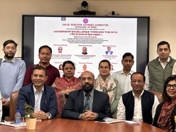 दिल्ली विश्वविद्यालय की मूल्य संवर्धन पाठ्यक्रम समिति द्वारा ‘गीता के माध्यम से नेतृत्व उत्कृष्टता’ विषय पर दो दिवसीय 16-17 फरवरी को क्षमता संवर्धन कार्यशाला (कैपिसिटी बिल्डिंग वर्कशॉप) का आयोजन किया गया। दिल्ली विश्वविद्यालय के विभिन्न महाविद्यालयों में पढ़ाने वाले शिक्षकों के लिए आयोजित इस कार्यशाला के उद्घाटन सत्र में मूल्य संवर्धन पाठ्यक्रम समिति के अध्यक्ष प्रो. निरंजन कुमार ने बताया कि आज के वैज्ञानिक युग में दिल्ली विश्वविद्यालय की मूल्य संवर्धन पाठ्यक्रम समिति द्वारा गीता जैसे धर्म ग्रंथ पर चार कोर्सेस बनाए गए हैं।