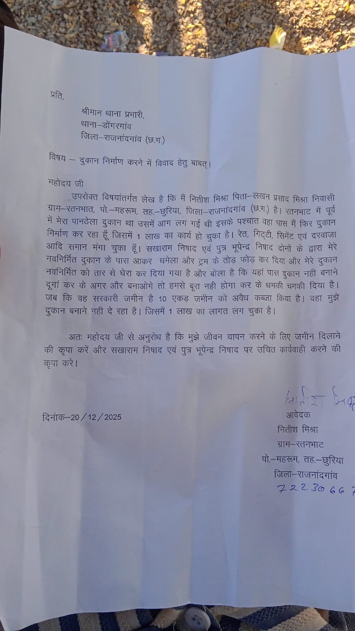 गौरतलब है कि पूर्व में उक्त दुकान को कुछ असामाजिक तत्वों के द्वारा तोड़ दिया गया था जिसे पुनः निर्माण के लिए रां मटेरियल राड सीमेंट जगह पर मंगाया है जिसे कुछ विध्न संतोषी लोगों के द्वारा आगजनी एवं तोड़फोड़ किया गया है इसकी शिकायत नीतीश मिश्रा निवासी रतनभाट ने डोंगरगांव थाना एवं तहसीलदार से भी किया है एवं न्याय दिलाने की मांग किया है नीतीश मिश्रा ने इस संवाददाता को बताया कि वह रतन भाट का निवासी है और बस स्टैंड में उनकी छोटी सी दुकान है जिसे कुछ कुछ असामाजिक तत्व द्वारा तोड़ दिया गया था जिसे पुनः निर्माण के लिए वह रां मटेरियल मंगाया हुआ था लेकिन पास में ही लगभग 10 एकड़ जमीन कब्जा कर चुके गांव के ही सखाराम निषाद एवं उनके पुत्र भूपेंद्र निषाद के द्वारा जबरदस्ती उसके दुकान में कांटा का घेरा कर दिया गया है और उन्हें धमकी चमकी लगाया जा रहा है की दुकान निर्माण करोगे तो ठीक नहीं होगा संभवतः दुकान में तोड़फोड़ उन्होंने किया होगा नीतीश मिश्रा ने शासन प्रशासन से आग्रह किया कि वह एक आम व्यक्ति है और छोटे से दुकान ही उनके जीवन यापन का साधन है कृपया इस जगह पर दुकान निर्माण करने की परमिशन दिया जाए व तोड़फोड़ करने वाले लोगों पर उचित कार्रवाई हो