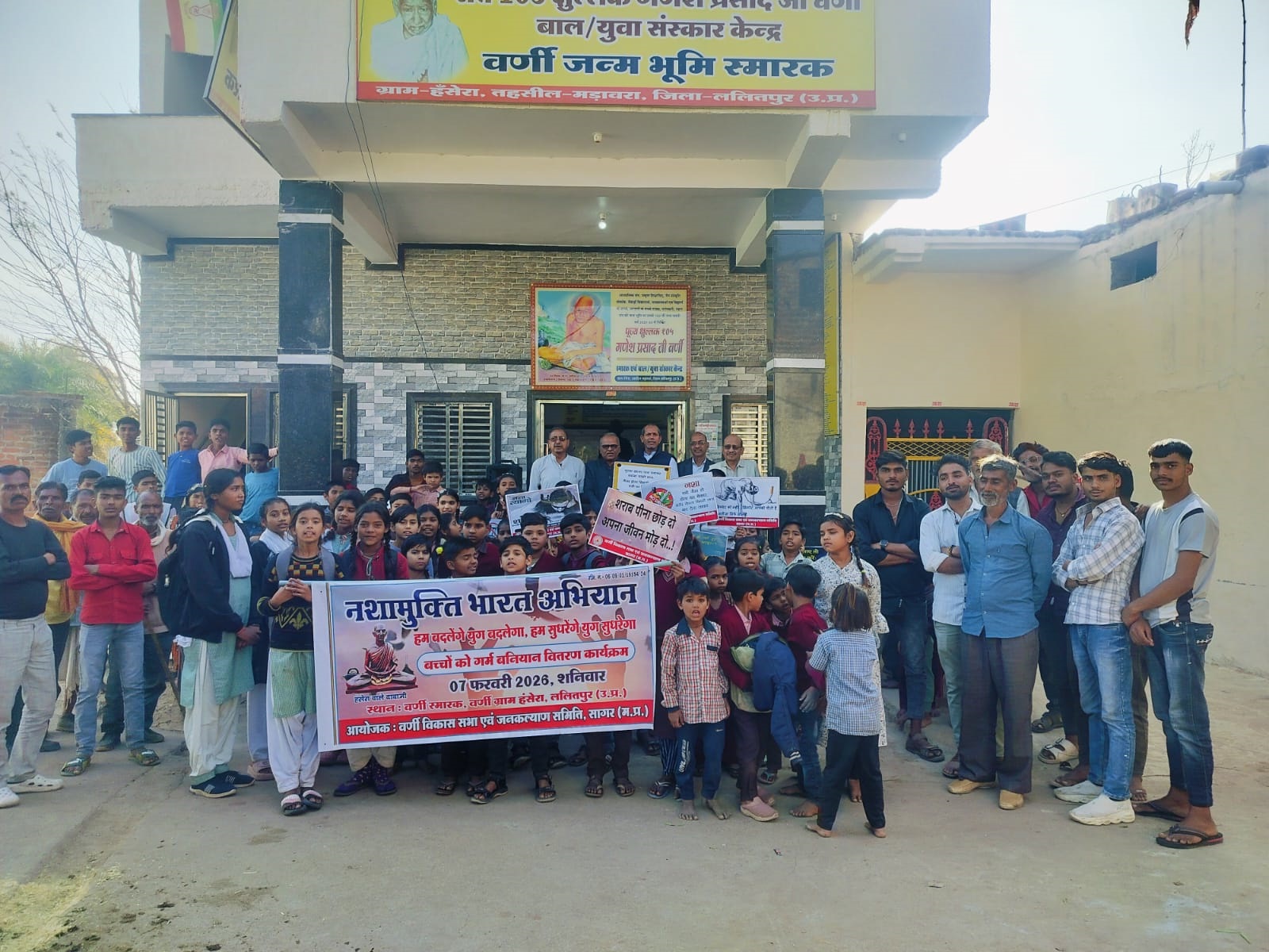 वर्णी ग्राम हंसेरा /- वर्णी संस्थान विकास सभा एवं जनकल्याण समिति के तत्वावधान में वर्णी जी की जन्मस्थली को नशा मुक्ति एवं व्यसन मुक्त ग्राम बनाने के उद्देश्य से नशा मुक्ति अभियान प्रारंभ में किया गया। सर्वप्रथम प्राथमिक शाला हंसेरा एवं ग्रामीणों के साथ बैनर पोस्टर एवं नशा विरोधी स्लोगन के साथ स्कूल से स्मारक तक रैली निकाल कर गांव के लोगों को नशा के प्रति जागरूक किया गया। वर्णी जन्मभूमि स्मारक में दीपप्रज्वलन, मंगलाचरण,स्वागत गीत के साथ कार्यक्रम प्रारंभ हुआ। कार्यक्रम की अध्यक्षता विनोद जैन LIC, मुख्य अतिथि ग्राम प्रधान छत्रपाल सिंह, अरुण चंदेरिया क्षेत्रीय अध्यक्ष भारतीय जैन मिलन क्षेत्र 10, विशिष्ट अतिथि डी. के. सराफ मड़ावरा, राजेंद्र जैन शिक्षक सागर रहें। संस्था परिचय एवं स्वागत भाषण महामंत्री कैलाश जैन टीला ने दिया। कार्यक्रम का संचालन मनीष विद्यार्थी ने किया। उपस्थित अतिथियों का सम्मान शाल श्रीफल से स्मारक व्यवस्थापक द्वारा किया गया।