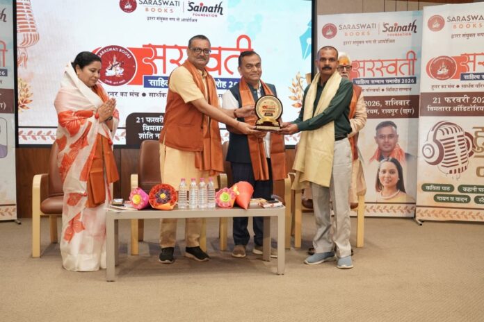 विमतारा सभागार रायपुर में सरस्वती बुक्स व श्री साईनाथ फाउंडेशन द्वारा संयुक्त रूप से आयोजित सरस्वती साहित्य सम्मान समारोह के अंतर्गत देश के वरिष्ठ साहित्यकार रुद्रनारायण पाणीग्राही को चतुर्थ सरस्वती साहित्य सम्मान प्रदान किया गया। नेताजी आनंद सिंघानिया की पावन स्मृति में विगत सात वर्षों से विभिन्न साहित्यिक सम्मान प्रदान किए जा रहे हैं, इसी कड़ी में इस वर्ष सातवां साहित्य रत्न सम्मान युवा गीतकार भरत द्विवेदी को व प्रथम पत्रकारिता रत्न सम्मान सुप्रसिद्ध पत्रकार तृप्ति सोनी को प्रदान किया गया।