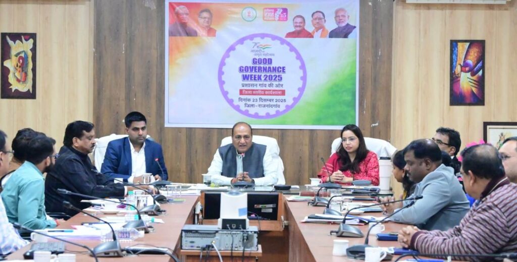 राजनांदगांव सुशासन सप्ताह अंतर्गत प्रशासन गांव की ओर अभियान के तहत आज कलेक्टोरेट सभाकक्ष में तत्कालीन कलेक्टर अशोक अग्रवाल ने सभी अधिकारियों को मार्गदर्शन दिया। अशोक अग्रवाल ने कहा कि राजनांदगांव जिले में टीम वर्क में उम्दा कार्य हो रहे है। उन्होंने कहा कि सुशासन सप्ताह में शासन की योजनाओं का लाभ जनसामान्य को अधिक से अधिक मिले।