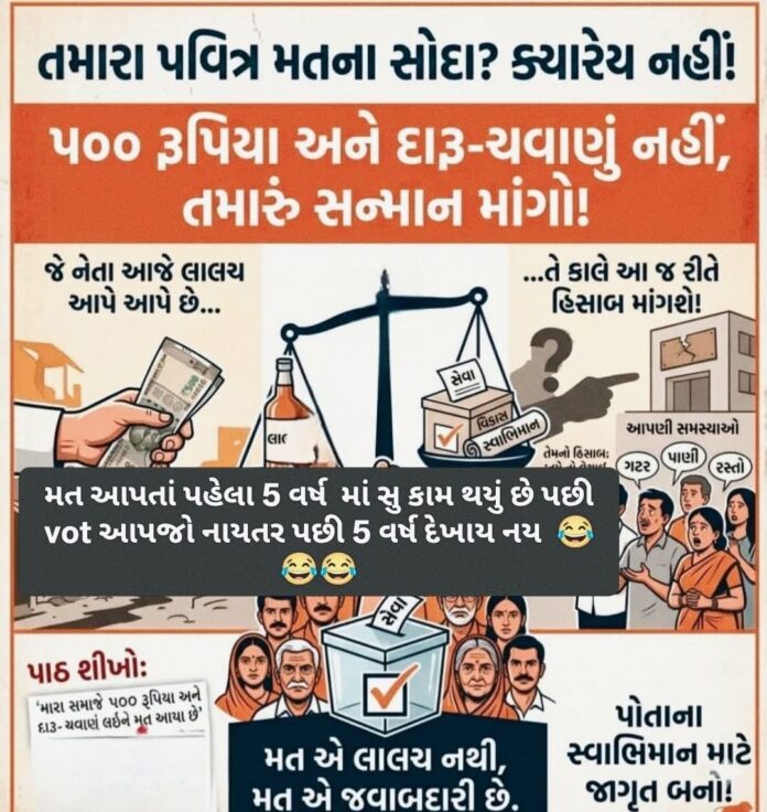 પાંચસો રૂપિયા અને દારૂ-ચવાણું નહીં, આ વખતે તમારું ‘સન્માન’ માંગો! તમારો એક કિંમતી વોટ લાલચને નહીં, પણ લાયકાતને આપો.