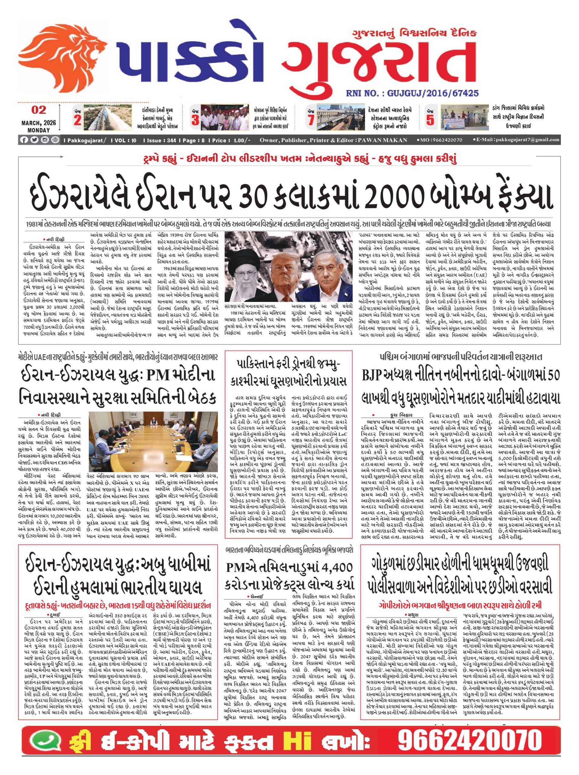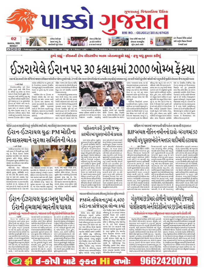 HomeepaperPAKKO GUJARAT : 02-03-2026 PAKKO GUJARAT : 02-03-2026 By pakkogujarat March 2, 2026 0 874 Share FacebookTwitterPinterestWhatsApp PAKKO_GUJARAT_02-03-2026Download Share FacebookTwitterPinterestWhatsApp Previous articleRashi : 02 માર્ચ, 2026નું રાશિ ભવિષ્યNext articleArticle : શિકારી અને શિકાર: પ્રેમ નહીં, આ એક રમત છે pakkogujarathttps://pakkogujarat.com/ RELATED ARTICLES epaper PAKKO GUJARAT : 01-03-2026 March 1, 2026 epaper PAKKO GUJARAT : 28-02-2026 February 28, 2026 epaper PAKKO GUJARAT : 26-02-2026 February 26, 2026 LEAVE A REPLY Cancel reply Comment: Please enter your comment! Name:* Please enter your name here Email:* You have entered an incorrect email address! Please enter your email address here Website: Save my name, email, and website in this browser for the next time I comment. - Advertisment - Most Popular Surat : દહેજની ભૂખે લીધો પરિણીતાનો જીવ, પોલીસે દુષ્પ્રેરણાના ગુનામાં બેની ધરપકડ કરી March 2, 2026 Entertainment : એપ્રિલમાં શકીરા ભારતમાં મચાવશે ધૂમ, ટિકિટના ભાવ સાંભળીને ઉડી જશે હોશ! March 2, 2026 Gandhinagar : ગુજરાત શહેરી વિકાસ મિશન (GUDM)ને મળશે બેસ્ટ કમ્યુનિટી ઇમ્પેક્ટ પ્રોજેક્ટ એવોર્ડ March 2, 2026 National : ‘કોઈ સાબિત કરી દે કે મેં લાંચ લીધી છે તો હું રાજકારણ છોડી દઈશ…’, કેજરીવાલનો ખુલ્લો પડકાર March 2, 2026 Load more Recent Comments