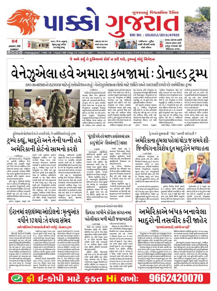 HomeepaperPAKKO GUJARAT : 04-01-2026 PAKKO GUJARAT : 04-01-2026 By pakkogujarat January 4, 2026 0 659 Share FacebookTwitterPinterestWhatsApp PAKKO_GUJARAT_04-01-2026Download Share FacebookTwitterPinterestWhatsApp Previous articleAnkleshwar : પાનોલી પોલીસે કતલખાને ધકેલાતા 80 પશુઓનો ઉગાર્યા, 40.60 લાખનો મુદ્દામાલ જપ્તNext articleMehsana : વિસનગર હોમગાર્ડના ઈન્ચાર્જ કમાન્ડિંગ બદલીની ફાઈલ આપવા 2 હજારની લાંચ લેતા રંગેહાથ ઝડપાયા pakkogujarathttps://pakkogujarat.com/ RELATED ARTICLES epaper PAKKO GUJARAT : 02-03-2026 March 2, 2026 epaper PAKKO GUJARAT : 01-03-2026 March 1, 2026 epaper PAKKO GUJARAT : 28-02-2026 February 28, 2026 LEAVE A REPLY Cancel reply Comment: Please enter your comment! Name:* Please enter your name here Email:* You have entered an incorrect email address! Please enter your email address here Website: Save my name, email, and website in this browser for the next time I comment. - Advertisment - Most Popular Entertainment : ‘મારે ઘરે જવું છે…’, યુદ્ધ વચ્ચે અબુ ધાબીમાં ફસાઈ બોલિવૂડ એક્ટ્રેસ, UAE સરકારના કર્યા વખાણ March 2, 2026 Valsad : વાપીમાં રીક્ષામાંથી 13.730 કિલોગ્રામ ગાંજાનો જથ્થો પકડાયો : પાંચની ધરપકડ, બે વોન્ટેડ March 2, 2026 National : ખામેનેઈના મોત મુદ્દે જમ્મુ-કાશ્મીરમાં હિંસક દેખાવો, ટોળાને વિખેરવા લાઠીચાર્જ, ટિયર ગેસના શેલ છોડ્યા March 2, 2026 Delhi : ઈરાન-અમેરિકા યુદ્ધની અસરને પગલે અમેરિકન દૂતાવાસ ખાતે સુરક્ષા વધારી દેવાઈ, ચુસ્ત બંદોબસ્ત ગોઠવાયો March 2, 2026 Load more Recent Comments