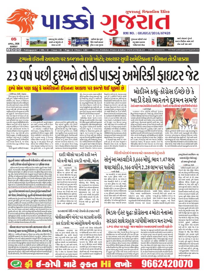 HomeepaperPAKKO GUJARAT : 05-04-2026 PAKKO GUJARAT : 05-04-2026 By pakkogujarat April 5, 2026 0 1132 Share FacebookXPinterestWhatsApp PAKKO_GUJARAT_05-04-2026Download Share FacebookXPinterestWhatsApp Previous article Rashi : 05 એપ્રિલ 2026નું રાશિ ભવિષ્યNext articleAhmedabad : સોનાના સિક્કાના બહાને રૃા.૧૦નો સિક્કો આપી મંગળસુત્ર લઇ રફૂચક્કર pakkogujarathttps://pakkogujarat.com/ RELATED ARTICLES epaper PAKKO GUJARAT : 04-04-2026 April 4, 2026 epaper PAKKO GUJARAT : 03-04-2026 April 3, 2026 epaper PAKKO GUJARAT : 02-04-2026 April 2, 2026 LEAVE A REPLY Cancel reply Comment: Please enter your comment! Name:* Please enter your name here Email:* You have entered an incorrect email address! Please enter your email address here Website: Save my name, email, and website in this browser for the next time I comment. - Advertisment - Most Popular National : ‘ચૂંટણી પછી થશે પાપોનો હિસાબ!’, PM મોદીએ બંગાળમાં TMCને આપી ચેતવણી April 5, 2026 Bollywood : સાઇ પલ્લવી અને વિજય સેતુપતિની જોડી આગામી ફિલ્મમાં જોવા મળશે April 5, 2026 Business : રૂ પરની આયાત ડયૂટી નાબુદ કરવા ગારમેન્ટ ઉદ્યોગ દ્વારા કરાયેલી રજૂઆત April 5, 2026 Surat : ઉનાળાની શરૂઆત સાથે જ સુરતની તાપી નદીમાં જળકુંભીની સમસ્યા શરુ April 5, 2026 Load more Recent Comments