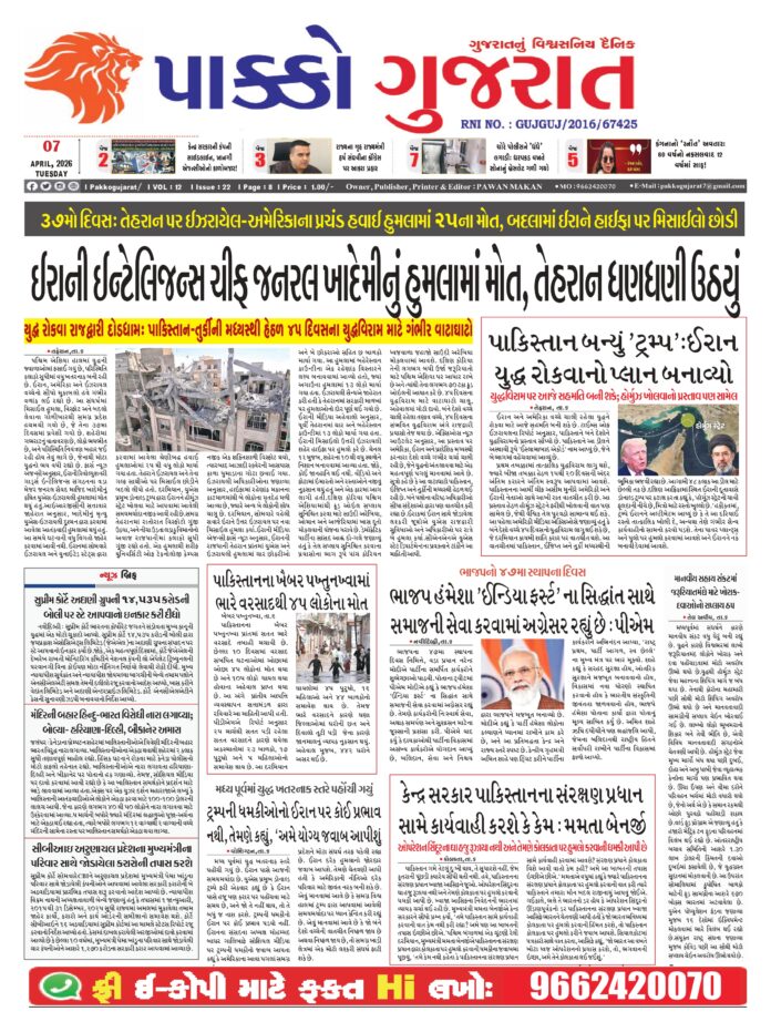 HomeepaperPAKKO GUJARAT : 07-04-2026 PAKKO GUJARAT : 07-04-2026 By pakkogujarat April 7, 2026 0 1150 Share FacebookXPinterestWhatsApp PAKKO_GUJARAT_07-04-2026Download Share FacebookXPinterestWhatsApp Previous articleGandhinagar : ગુજરાતીઓનું અપમાન સહન નહીં! મલ્લિકાર્જુન ખડગેના વિવાદાસ્પદ નિવેદનથી 6 કરોડ ગુજરાતીઓમાં ભારે રોષ: ગાંધી-સરદારની પુણ્યધરતીના ગૌરવને ઠેસNext articleRashifal : આજ ના રાશિભવિષ્ય pakkogujarathttps://pakkogujarat.com/ RELATED ARTICLES epaper PAKKO GUJARAT : 06-04-2026 April 6, 2026 epaper PAKKO GUJARAT : 05-04-2026 April 5, 2026 epaper PAKKO GUJARAT : 04-04-2026 April 4, 2026 LEAVE A REPLY Cancel reply Comment: Please enter your comment! Name:* Please enter your name here Email:* You have entered an incorrect email address! Please enter your email address here Website: Save my name, email, and website in this browser for the next time I comment. - Advertisment - Most Popular Sports : SRHના પ્લેયરને ભોજન કરવું ભારે પડ્યું, પરસેવાથી રેબઝેબ થયો આ ખેલાડી April 7, 2026 National : LPG અંગે કેન્દ્રનો મોટો નિર્ણય: તમામ રાજ્યો માટે 5 કિલોના સિલિન્ડરની સપ્લાય ડબલ April 7, 2026 Amreli : મોરવાડા રોડ પર બાઇક અને રીક્ષા વચ્ચે ગમખ્વાર અકસ્માત, રીક્ષામાંથી કેફી પીણાનો જથ્થો મળ્યો April 7, 2026 National : પિતા-પુત્રોને કિડનેપ કરી ભાગતા 3 કિડનેપર્સનું અકસ્માતમાં મોત, બાળકો સુરક્ષિત April 7, 2026 Load more Recent Comments