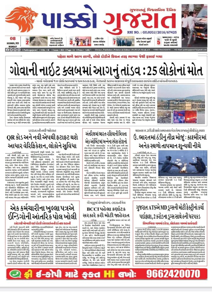 HomeepaperPAKKO GUJARAT : 08-12-2025 PAKKO GUJARAT : 08-12-2025 By pakkogujarat December 8, 2025 0 625 Share FacebookTwitterPinterestWhatsApp PAKKO_GUJARAT_08-12-2025 (1)Download Share FacebookTwitterPinterestWhatsApp Previous articleGujarat : સાબરમતી નદીમાંથી અજાણ્યા યુવકનો મૃતદેહ મળ્યોNext articleAhmedabad : પ્રમુખ સ્વામી મહારાજની પ્રમુખવરણી મહોત્સવની ભવ્ય સમાપન સમારોહની ઉજવણી pakkogujarathttps://pakkogujarat.com/ RELATED ARTICLES epaper PAKKO GUJARAT : 02-03-2026 March 2, 2026 epaper PAKKO GUJARAT : 01-03-2026 March 1, 2026 epaper PAKKO GUJARAT : 28-02-2026 February 28, 2026 LEAVE A REPLY Cancel reply Comment: Please enter your comment! Name:* Please enter your name here Email:* You have entered an incorrect email address! Please enter your email address here Website: Save my name, email, and website in this browser for the next time I comment. - Advertisment - Most Popular Entertainment : ‘મારે ઘરે જવું છે…’, યુદ્ધ વચ્ચે અબુ ધાબીમાં ફસાઈ બોલિવૂડ એક્ટ્રેસ, UAE સરકારના કર્યા વખાણ March 2, 2026 Valsad : વાપીમાં રીક્ષામાંથી 13.730 કિલોગ્રામ ગાંજાનો જથ્થો પકડાયો : પાંચની ધરપકડ, બે વોન્ટેડ March 2, 2026 National : ખામેનેઈના મોત મુદ્દે જમ્મુ-કાશ્મીરમાં હિંસક દેખાવો, ટોળાને વિખેરવા લાઠીચાર્જ, ટિયર ગેસના શેલ છોડ્યા March 2, 2026 Delhi : ઈરાન-અમેરિકા યુદ્ધની અસરને પગલે અમેરિકન દૂતાવાસ ખાતે સુરક્ષા વધારી દેવાઈ, ચુસ્ત બંદોબસ્ત ગોઠવાયો March 2, 2026 Load more Recent Comments