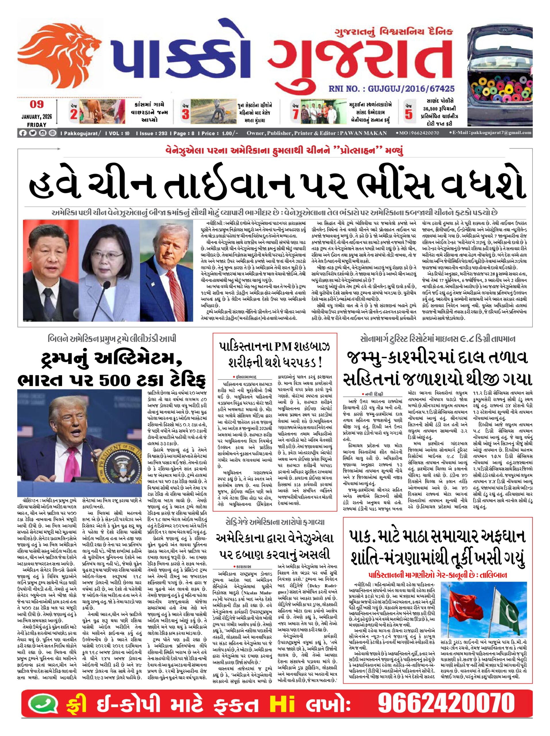 HomeepaperPAKKO GUJARAT : 09-01-2026 PAKKO GUJARAT : 09-01-2026 By pakkogujarat January 9, 2026 0 683 Share FacebookTwitterPinterestWhatsApp PAKKO_GUJARAT_09-01-2026Download Share FacebookTwitterPinterestWhatsApp Previous articleGujarat : મહીસાગર જિલ્લા કલેકટર અર્પિત સાગરના અધ્યક્ષસ્થાને પ્રજાસત્તાક દિવસની ઉજવણી અંગે સમીક્ષા બેઠક યોજાઈNext articleGujarat : सोमनाथ में जूनागढ के योग बोर्ड आदि संस्थानों की महिलाओं द्वारा अखंड शिवधुन का प्रारंभ pakkogujarathttps://pakkogujarat.com/ RELATED ARTICLES epaper PAKKO GUJARAT : 02-03-2026 March 2, 2026 epaper PAKKO GUJARAT : 01-03-2026 March 1, 2026 epaper PAKKO GUJARAT : 28-02-2026 February 28, 2026 LEAVE A REPLY Cancel reply Comment: Please enter your comment! Name:* Please enter your name here Email:* You have entered an incorrect email address! Please enter your email address here Website: Save my name, email, and website in this browser for the next time I comment. - Advertisment - Most Popular Entertainment : ‘મારે ઘરે જવું છે…’, યુદ્ધ વચ્ચે અબુ ધાબીમાં ફસાઈ બોલિવૂડ એક્ટ્રેસ, UAE સરકારના કર્યા વખાણ March 2, 2026 Valsad : વાપીમાં રીક્ષામાંથી 13.730 કિલોગ્રામ ગાંજાનો જથ્થો પકડાયો : પાંચની ધરપકડ, બે વોન્ટેડ March 2, 2026 National : ખામેનેઈના મોત મુદ્દે જમ્મુ-કાશ્મીરમાં હિંસક દેખાવો, ટોળાને વિખેરવા લાઠીચાર્જ, ટિયર ગેસના શેલ છોડ્યા March 2, 2026 Delhi : ઈરાન-અમેરિકા યુદ્ધની અસરને પગલે અમેરિકન દૂતાવાસ ખાતે સુરક્ષા વધારી દેવાઈ, ચુસ્ત બંદોબસ્ત ગોઠવાયો March 2, 2026 Load more Recent Comments