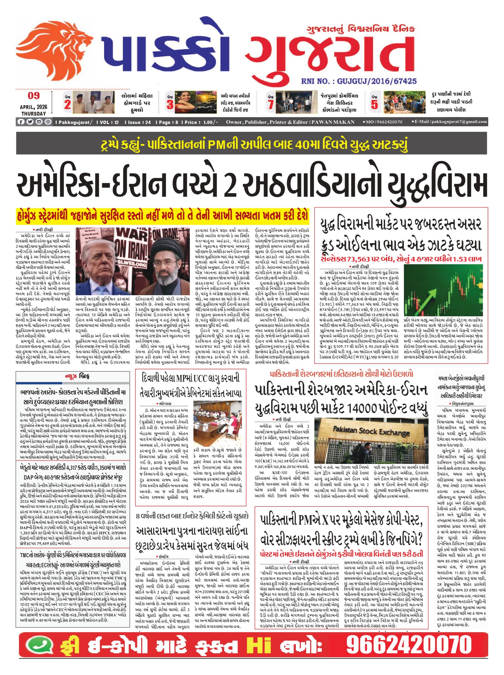 HomeepaperPAKKO GUJARAT : 09-04-2026 PAKKO GUJARAT : 09-04-2026 By pakkogujarat April 9, 2026 0 1169 Share FacebookXPinterestWhatsApp PAKKO_GUJARAT_09-04-2026Download Share FacebookXPinterestWhatsApp Previous articleRashi : 09 એપ્રિલ 2026નું રાશિ ભવિષ્યNext articleBusiness : ક્રૂડ તેલના વાયદામાં રૂ.1920નો કડાકોઃ સોનાના વાયદામાં રૂ.3011 અને ચાંદીના વાયદામાં રૂ.14323નો તીવ્ર ઉછાળો pakkogujarathttps://pakkogujarat.com/ RELATED ARTICLES epaper PAKKO GUJARAT : 08-04-2026 April 8, 2026 epaper PAKKO GUJARAT : 07-04-2026 April 7, 2026 epaper PAKKO GUJARAT : 06-04-2026 April 6, 2026 LEAVE A REPLY Cancel reply Comment: Please enter your comment! Name:* Please enter your name here Email:* You have entered an incorrect email address! Please enter your email address here Website: Save my name, email, and website in this browser for the next time I comment. - Advertisment - Most Popular Bihar : નીતિશ કુમાર ક્યારે છોડશે CM પદ? ડેટ થઇ ગઇ ફાઇનલ ! April 9, 2026 Kanpur : કિડની ટ્રાન્સપ્લાન્ટ રેકેટ, નોટોની પથારી પર સુનાર પરવેઝ સૈફીની ધરપકડ April 9, 2026 Gujarat : અંબાલાલ પટેલની આગાહી, રાજ્યમાં ગરમીનો પારો 46 ડિગ્રી સુધી પહોંચી શકે છે April 9, 2026 National : 48 વર્ષ પછી ખુલ્યો પુરીના જગન્નાથ મંદિરનો રત્ન ભંડાર, 78 સોના અને 33 ચાંદીના દાગીનાનું થશે ડિજિટલ ડોક્યુમેન્ટેશન April 9, 2026 Load more Recent Comments