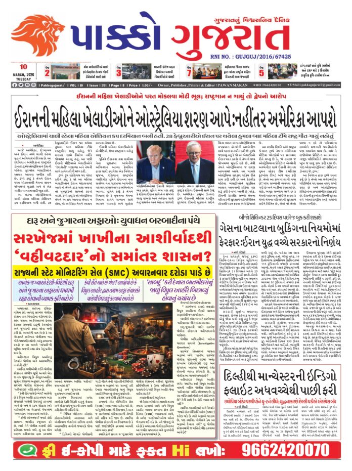 HomeepaperPAKKO GUJARAT : 10-03-2026 PAKKO GUJARAT : 10-03-2026 By pakkogujarat March 10, 2026 0 926 Share FacebookTwitterPinterestWhatsApp PAKKO_GUJARAT_10-03-2026Download Share FacebookTwitterPinterestWhatsApp Previous articleRashi : 10 માર્ચ 2026નું રાશિ ભવિષ્યNext articleGandhinagar : હાઇવે ઓથોરિટીના અધિકારી હાજર ન રહેતા સુનાવણી મોકૂફ ઃ ખેડૂતોમાં આક્રોશ pakkogujarathttps://pakkogujarat.com/ RELATED ARTICLES epaper PAKKO GUJARAT : 08-03-2026 March 8, 2026 epaper PAKKO GUJARAT : 06-03-2026 March 6, 2026 epaper PAKKO GUJARAT : 03-03-2026 March 3, 2026 LEAVE A REPLY Cancel reply Comment: Please enter your comment! Name:* Please enter your name here Email:* You have entered an incorrect email address! Please enter your email address here Website: Save my name, email, and website in this browser for the next time I comment. - Advertisment - Most Popular Gujarat : રાજ્યના 10 જિલ્લામાં ગરમીનું ઓરેન્જ એલર્ટ, 41 ડિગ્રી તાપમાન રહેવાની આગાહી March 10, 2026 Gujarat : પંચમહાલના ગોધરા પોસ્ટ ઓફિસ અને પાસપોર્ટ કેન્દ્રને બોમ્બથી ઉડાવી દેવાની ધમકી, ઈમેલ મળતા ખળભળાટ March 10, 2026 Gandhinagar : ઈન્દ્રોડા કટ પાસે બેરિકેટ સાથે મોપેડ અથડાતા સુદાનના યુવકનું ઘટનાસ્થળે જ મોત March 10, 2026 National : ‘કોવિડ વેક્સિનની આડઅસરથી પીડિતા લોકો માટે વળતરની નીતિ તૈયાર કરો…’ સુપ્રીમ કોર્ટનો કેન્દ્રને આદેશ March 10, 2026 Load more Recent Comments
