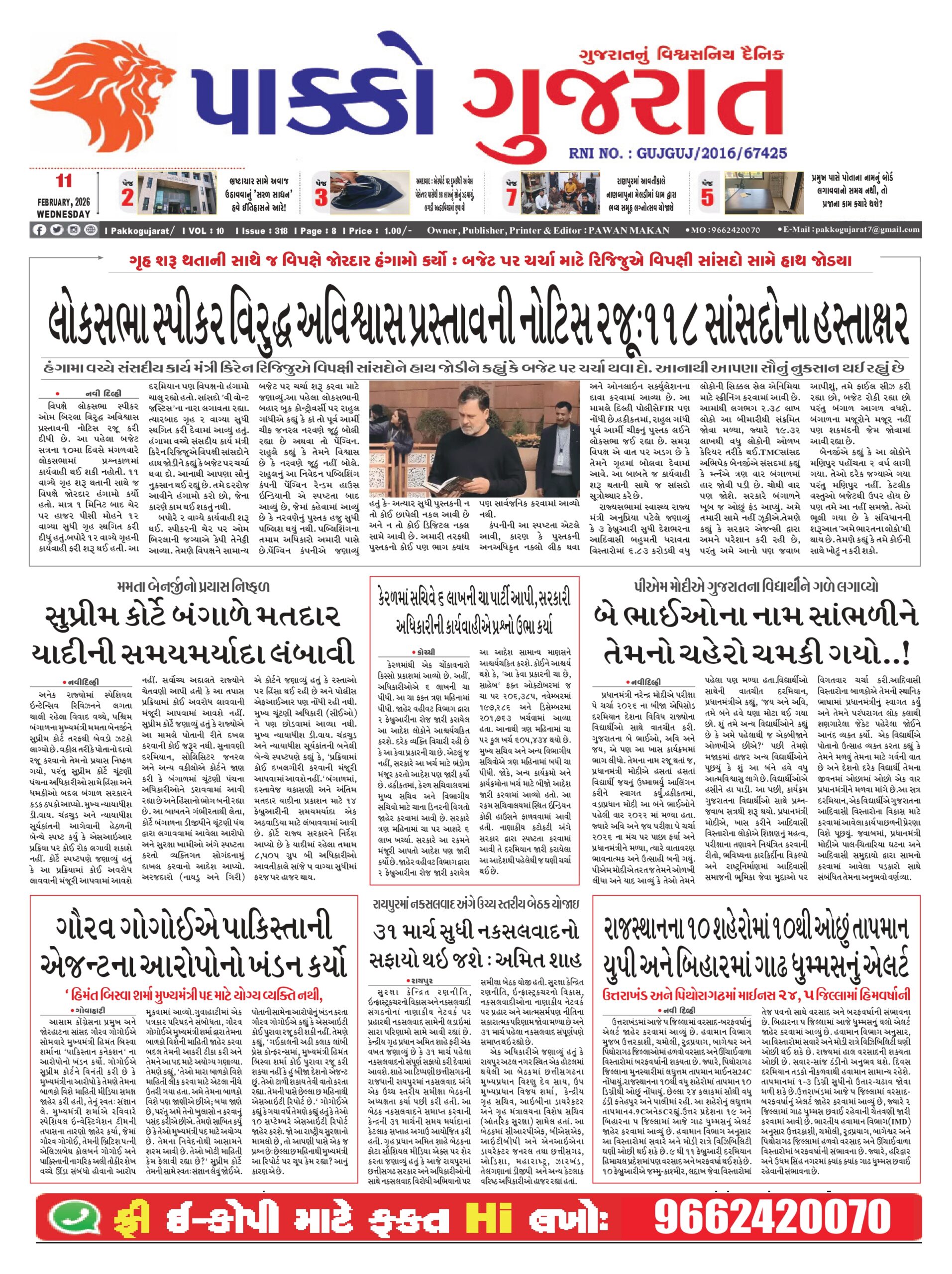 HomeepaperPAKKO GUJARAT : 11-02-2026 PAKKO GUJARAT : 11-02-2026 By pakkogujarat February 11, 2026 0 787 Share FacebookTwitterPinterestWhatsApp PAKKO_GUJARAT_11-02-2026Download Share FacebookTwitterPinterestWhatsApp Previous articleGujarat : અંબુજા ફાઉન્ડેશન દ્વારા બ્રેસ્ટ કૅન્સર અવેરનેસ ત્રિ દિવસીય વર્કશોપનું આયોજન કરવામાં આવ્યુંNext articleBusiness : સોનાના વાયદામાં રૂ.319, ચાંદીમાં રૂ.2381 અને ક્રૂડ તેલના વાયદામાં રૂ.43ની નરમાઇઃ ઇલેક્ટ્રિસિટી વાયદામાં રૂ.71નો સુધારો pakkogujarathttps://pakkogujarat.com/ RELATED ARTICLES epaper PAKKO GUJARAT : 02-03-2026 March 2, 2026 epaper PAKKO GUJARAT : 01-03-2026 March 1, 2026 epaper PAKKO GUJARAT : 28-02-2026 February 28, 2026 LEAVE A REPLY Cancel reply Comment: Please enter your comment! Name:* Please enter your name here Email:* You have entered an incorrect email address! Please enter your email address here Website: Save my name, email, and website in this browser for the next time I comment. - Advertisment - Most Popular National : ખામેનેઈના મોત મુદ્દે જમ્મુ-કાશ્મીરમાં હિંસક દેખાવો, ટોળાને વિખેરવા લાઠીચાર્જ, ટિયર ગેસના શેલ છોડ્યા March 2, 2026 Delhi : ઈરાન-અમેરિકા યુદ્ધની અસરને પગલે અમેરિકન દૂતાવાસ ખાતે સુરક્ષા વધારી દેવાઈ, ચુસ્ત બંદોબસ્ત ગોઠવાયો March 2, 2026 National : 11 घंटे बंद रहेगा राम मंदिर, जानें कब खुलेगा राम लला का द्वार? March 2, 2026 Gujarat : માઉન્ટ આબુ ખાતે રાજ્ય સરકાર યોજશે નિ:શુલ્ક પર્વતારોહણ તાલીમ, રહેવા-જમવા સહિતની સુવિધા ફ્રી March 2, 2026 Load more Recent Comments