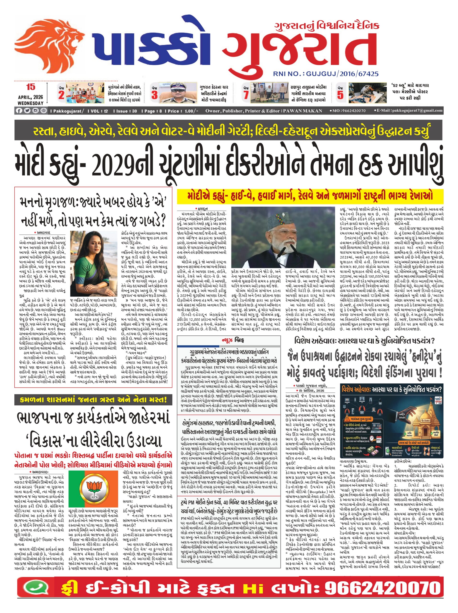 HomeepaperPAKKO GUJARAT : 13-04-2026 PAKKO GUJARAT : 13-04-2026 By pakkogujarat April 15, 2026 0 1217 Share FacebookXPinterestWhatsApp PAKKO_GUJRAT_15-04-2026Download Share FacebookXPinterestWhatsApp Previous articleNational : આવતીકાલથી ટોલ ટેક્સના નિયમમાં ફેરફાર, જાણો સરકારની નવી ગાઈડલાઈનNext articleRashifal : આજ કા રાશિફળ…. pakkogujarathttps://pakkogujarat.com/ RELATED ARTICLES epaper PAKKO GUJARAT : 13-04-2026 April 13, 2026 epaper PAKKO GUJARAT : 12-04-2026 April 12, 2026 epaper PAKKO GUJARAT : 11-04-2026 April 11, 2026 LEAVE A REPLY Cancel reply Comment: Please enter your comment! Name:* Please enter your name here Email:* You have entered an incorrect email address! Please enter your email address here Website: Save my name, email, and website in this browser for the next time I comment. - Advertisment - Most Popular Entertainment : Saiyara ટીમ ફરી સાથે આવી! અહાન પાંડે અને અનીત પડ્ડા ફરી એકસાથે, બોલીવુડને મળશે નવી રોમેન્ટિક ફિલ્મ! April 15, 2026 Entertainment : 4000 કરોડની રામાયણ પર મોટો ખતરો! દિવાળી પર આ હોલીવુડ ફિલ્મ સાથે થશે મહામુકાબલો? April 15, 2026 National : મહિલાઓ અને યુવાનોને બાકી રહેલા ડીએ, 3000 રૂપિયા પ્રતિ માસ ચૂકવવા… ભાજપે બંગાળ માટે ‘ખાતરી પત્ર’ જારી કર્યો April 15, 2026 National : બિહારમાં પહેલીવાર બીજેપી CM, સમ્રાટ ચૌધરીએ લીધા શપથ April 15, 2026 Load more Recent Comments