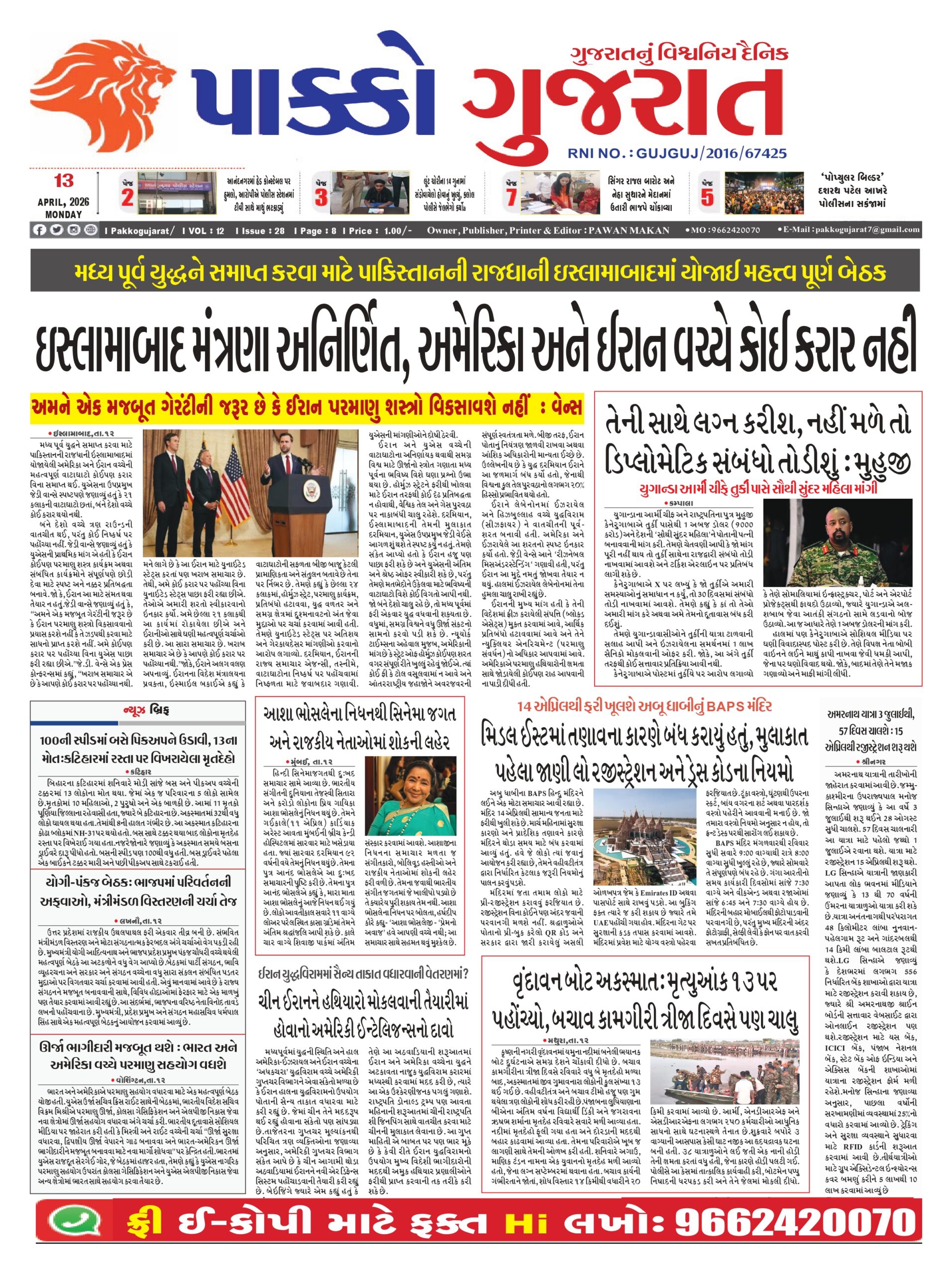 HomeepaperPAKKO GUJARAT : 13-04-2026 PAKKO GUJARAT : 13-04-2026 By pakkogujarat April 13, 2026 0 1203 Share FacebookXPinterestWhatsApp PAKKO_GUJARAT_13-04-2026Download Share FacebookXPinterestWhatsApp Previous articleRashi : 13 એપ્રિલ, 2026નું રાશિ ભવિષ્યNext articleArticle : મનનો મૃગજળ: જ્યારે ખબર હોય કે ‘એ’ નહીં મળે, તો પણ મન કેમ ત્યાં જ ગબડે? pakkogujarathttps://pakkogujarat.com/ RELATED ARTICLES epaper PAKKO GUJARAT : 12-04-2026 April 12, 2026 epaper PAKKO GUJARAT : 11-04-2026 April 11, 2026 epaper PAKKO GUJARAT : 10-04-2026 April 10, 2026 LEAVE A REPLY Cancel reply Comment: Please enter your comment! Name:* Please enter your name here Email:* You have entered an incorrect email address! Please enter your email address here Website: Save my name, email, and website in this browser for the next time I comment. - Advertisment - Most Popular National : આવતીકાલથી ટોલ ટેક્સના નિયમમાં ફેરફાર, જાણો સરકારની નવી ગાઈડલાઈન April 14, 2026 Lifestyle : 52ની ઉંમરમાં પણ 25 જેવી ફિટનેસ! Malaika Arora એ શેર કરી પોતાની ફિટનેસનું સિક્રેટ! April 14, 2026 National : ભક્તોને દર્શન આપવા અમરનાથ પ્રગટ થયાં, પૂર્ણ સ્વરૂપમાં બાબા બર્ફાનીની પ્રથમ તસવીર April 14, 2026 Junagadh : કાળવા ચોકમાં આંબેડકર જયંતિની ઉજવણી વચ્ચે ‘આખલા યુદ્ધ’, ફાયર બ્રિગેડે પાણીનો મારો ચલાવવો પડ્યો April 14, 2026 Load more Recent Comments