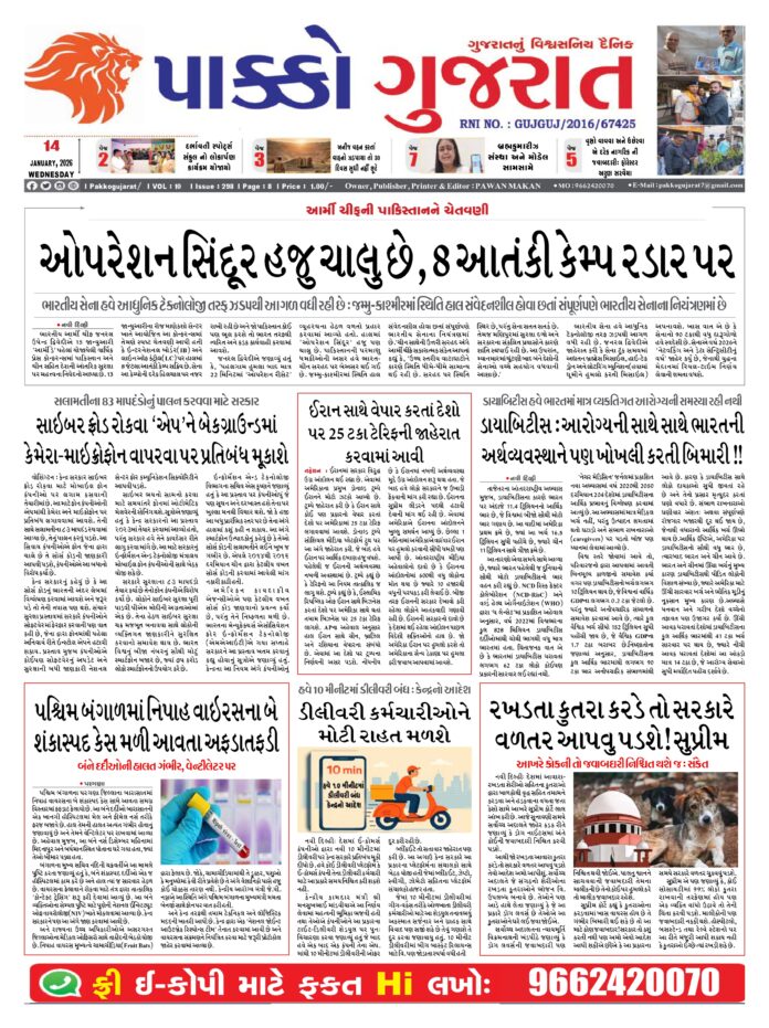 HomeepaperPAKKO GUJARAT : 14-01-2026 PAKKO GUJARAT : 14-01-2026 By pakkogujarat January 14, 2026 0 702 Share FacebookTwitterPinterestWhatsApp PAKKO_GUJARAT_14-01-2026Download Share FacebookTwitterPinterestWhatsApp Previous articleGujarat : બ્રહ્મકુમારીઝ સંસ્થા અને મોડેલ સામસામે: યુવતીનો ‘અઘટિત’ કૃત્યનો ગંભીર આક્ષેપ, સંસ્થાએ કહ્યું- ‘VIP ટ્રીટમેન્ટ ન મળતા બદનામ કરવાનું કાવતરું’Next articleNational : डोंगरगढ़ थाना का पुलिस अधीक्षक द्वारा आकस्मिक निरीक्षण pakkogujarathttps://pakkogujarat.com/ RELATED ARTICLES epaper PAKKO GUJARAT : 02-03-2026 March 2, 2026 epaper PAKKO GUJARAT : 01-03-2026 March 1, 2026 epaper PAKKO GUJARAT : 28-02-2026 February 28, 2026 LEAVE A REPLY Cancel reply Comment: Please enter your comment! Name:* Please enter your name here Email:* You have entered an incorrect email address! Please enter your email address here Website: Save my name, email, and website in this browser for the next time I comment. - Advertisment - Most Popular Entertainment : ‘મારે ઘરે જવું છે…’, યુદ્ધ વચ્ચે અબુ ધાબીમાં ફસાઈ બોલિવૂડ એક્ટ્રેસ, UAE સરકારના કર્યા વખાણ March 2, 2026 Valsad : વાપીમાં રીક્ષામાંથી 13.730 કિલોગ્રામ ગાંજાનો જથ્થો પકડાયો : પાંચની ધરપકડ, બે વોન્ટેડ March 2, 2026 National : ખામેનેઈના મોત મુદ્દે જમ્મુ-કાશ્મીરમાં હિંસક દેખાવો, ટોળાને વિખેરવા લાઠીચાર્જ, ટિયર ગેસના શેલ છોડ્યા March 2, 2026 Delhi : ઈરાન-અમેરિકા યુદ્ધની અસરને પગલે અમેરિકન દૂતાવાસ ખાતે સુરક્ષા વધારી દેવાઈ, ચુસ્ત બંદોબસ્ત ગોઠવાયો March 2, 2026 Load more Recent Comments
