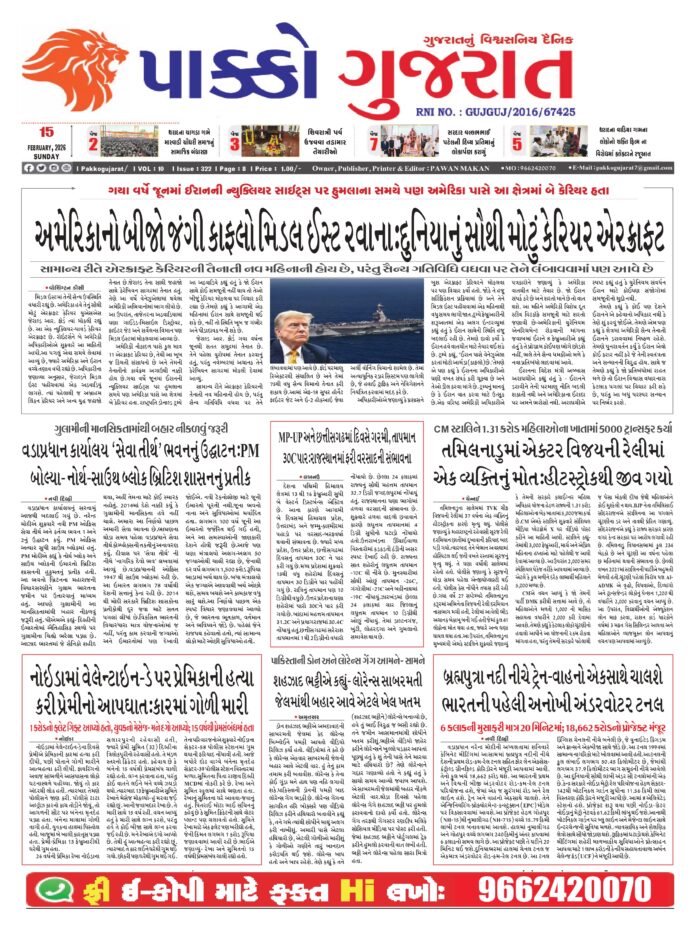 HomeepaperPAKKO GUJARAT : 15-02-2026 PAKKO GUJARAT : 15-02-2026 By pakkogujarat February 15, 2026 0 804 Share FacebookTwitterPinterestWhatsApp PAKKO_GUJARAT_15-02-2026Download Share FacebookTwitterPinterestWhatsApp Previous articleGujarat : થરાદના ચાગડા ગામે મારવાડી ચૌધરી સમાજનું સામાજિક બંધારણ: ‘એક સમાજ, એક જાજમ, એક રિવાજ’ મુજબ બંધારણ ઘડ્યુંNext articleGandhinagar : प्रधानमंत्री श्री नरेन्द्र मोदी के करकमलों से भावनगर में 50 अत्याधुनिक इलेक्ट्रिक बसों का लोकार्पण, प्रधानमंत्री ने असम से दिखाई हरी झंडी pakkogujarathttps://pakkogujarat.com/ RELATED ARTICLES epaper PAKKO GUJARAT : 02-03-2026 March 2, 2026 epaper PAKKO GUJARAT : 01-03-2026 March 1, 2026 epaper PAKKO GUJARAT : 28-02-2026 February 28, 2026 LEAVE A REPLY Cancel reply Comment: Please enter your comment! Name:* Please enter your name here Email:* You have entered an incorrect email address! Please enter your email address here Website: Save my name, email, and website in this browser for the next time I comment. - Advertisment - Most Popular National : ખામેનેઈના મોત મુદ્દે જમ્મુ-કાશ્મીરમાં હિંસક દેખાવો, ટોળાને વિખેરવા લાઠીચાર્જ, ટિયર ગેસના શેલ છોડ્યા March 2, 2026 Delhi : ઈરાન-અમેરિકા યુદ્ધની અસરને પગલે અમેરિકન દૂતાવાસ ખાતે સુરક્ષા વધારી દેવાઈ, ચુસ્ત બંદોબસ્ત ગોઠવાયો March 2, 2026 National : 11 घंटे बंद रहेगा राम मंदिर, जानें कब खुलेगा राम लला का द्वार? March 2, 2026 Gujarat : માઉન્ટ આબુ ખાતે રાજ્ય સરકાર યોજશે નિ:શુલ્ક પર્વતારોહણ તાલીમ, રહેવા-જમવા સહિતની સુવિધા ફ્રી March 2, 2026 Load more Recent Comments