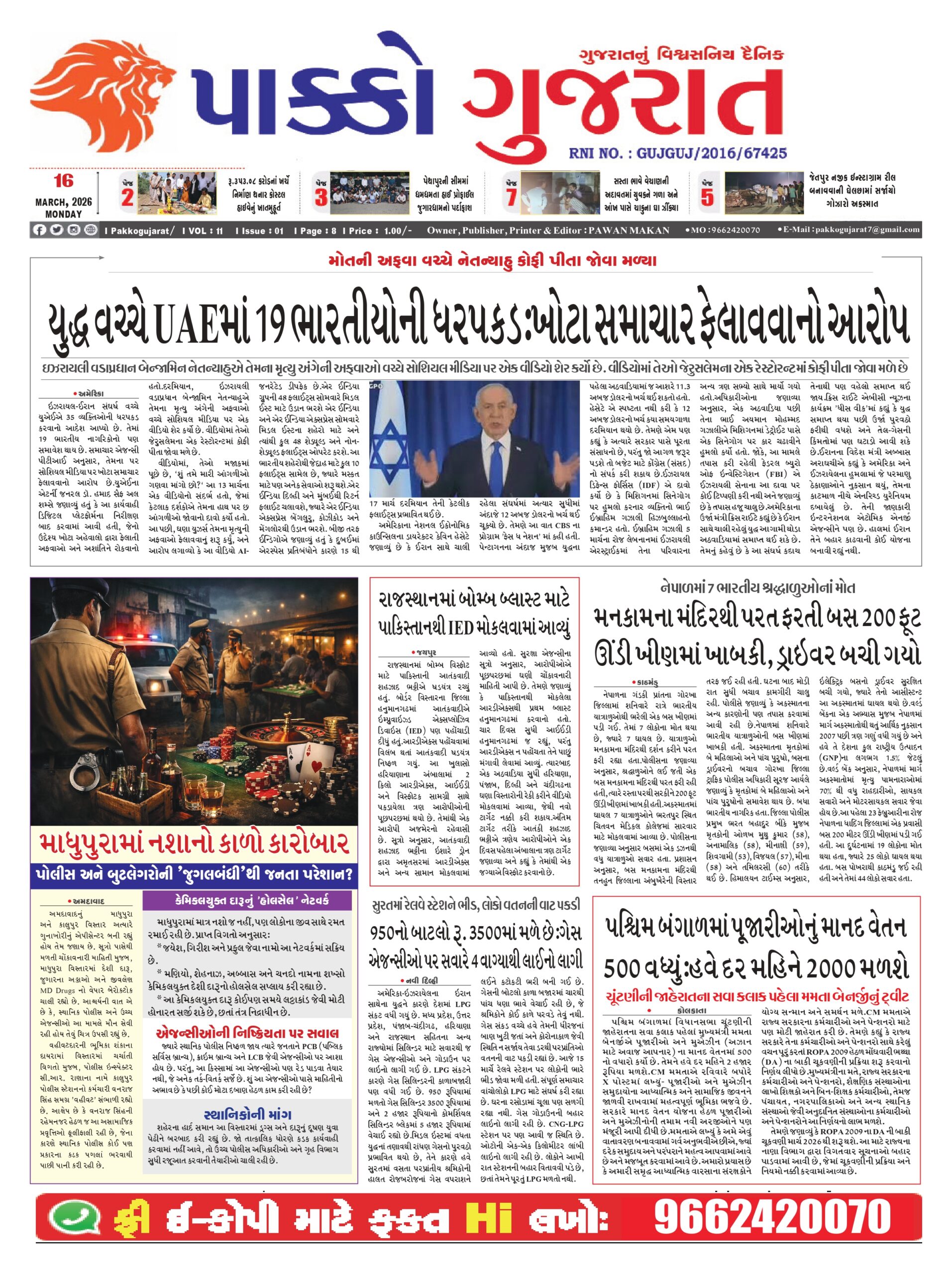 HomeepaperPAKKO GUJARAT : 16-03-2026 PAKKO GUJARAT : 16-03-2026 By pakkogujarat March 16, 2026 0 984 Share FacebookXPinterestWhatsApp PAKKO_GUJARAT_16-03-2026Download Share FacebookXPinterestWhatsApp Previous articleGandhinagar : દહેગામમાં સાંસદના કાર્યક્રમમાં વિરોધ કરવા પહોંચેલા પશુપાલકોની અટકાયતNext articleVadodara : જય ભવાની નગરમાં પાણી -ડ્રેનેજની સમસ્યા મુદ્દે રહીશોનો વિરોધ pakkogujarathttps://pakkogujarat.com/ RELATED ARTICLES epaper PAKKO GUJARAT : 12-04-2026 April 12, 2026 epaper PAKKO GUJARAT : 11-04-2026 April 11, 2026 epaper PAKKO GUJARAT : 10-04-2026 April 10, 2026 LEAVE A REPLY Cancel reply Comment: Please enter your comment! Name:* Please enter your name here Email:* You have entered an incorrect email address! Please enter your email address here Website: Save my name, email, and website in this browser for the next time I comment. - Advertisment - Most Popular Entertainment : ભારતના સૌથી અમીર સિંગર્સમાંના એક હતા આશા ભોંસલે! April 12, 2026 Asha Bhosle Passes Away : સુપ્રસિદ્ધ ગાયિકા આશા ભોંસલેનું 92 વર્ષની વયે નિધન, દેશભરમાં શોકની લહેર April 12, 2026 World : યુદ્ધ રોકવા અમેરિકા-ઇરાનની વાટાઘાટો અનિર્ણિત April 12, 2026 World : અમેરિકાનું ઓઈલ અને ગેસ ખરીદવા વિશ્વભરમાંથી ટેન્કરો આવી રહ્યા છે : ટ્રમ્પ April 12, 2026 Load more Recent Comments