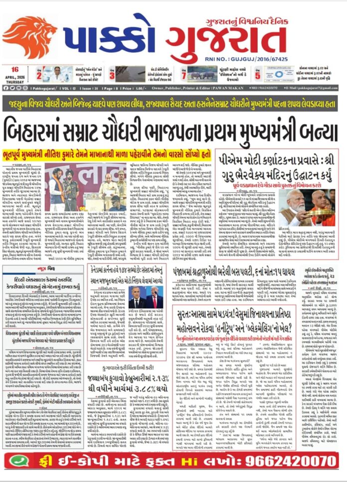 HomeepaperPAKKO GUJARAT : 16-04-2026 PAKKO GUJARAT : 16-04-2026 By pakkogujarat April 16, 2026 0 1233 Share FacebookXPinterestWhatsApp PAKKO_GUJARAT_16-04-2026Download Share FacebookXPinterestWhatsApp Previous articleRashi : 16 એપ્રિલ 2026નું રાશિ ભવિષ્યNext articleGujarat : ઘાસના ભૂસાની આડમાં દારૂની હેરાફેરી : મહારાષ્ટ્રથી ગુજરાતમાં ઘૂસાડાતા દારૂ ભરેલું કન્ટેનર કરજણ પાસે ઝડપાયું pakkogujarathttps://pakkogujarat.com/ RELATED ARTICLES epaper PAKKO GUJARAT : 13-04-2026 April 15, 2026 epaper PAKKO GUJARAT : 13-04-2026 April 13, 2026 epaper PAKKO GUJARAT : 12-04-2026 April 12, 2026 LEAVE A REPLY Cancel reply Comment: Please enter your comment! Name:* Please enter your name here Email:* You have entered an incorrect email address! Please enter your email address here Website: Save my name, email, and website in this browser for the next time I comment. - Advertisment - Most Popular Delhi : એરપોર્ટ પર મોટી દુર્ઘટના ટળી, સ્પાઈસ જેટ અને અકાસા એરના વિંગ્સ અથડાયા April 16, 2026 Entertainment : જાણીતા બોલિવૂડ સિંગરે ગુપચુપ કરી લીધા લગ્ન? બાળપણની પ્રેમિકા સાથે પ્રાઈવેટ સેરેમનીમાં લીધા સાત ફેરા April 16, 2026 Sports : આજે મુંબઈ ઈન્ડિયન્સનો મુકાબલો પંજાબ કિંગ્સ સામે થશે, બંને ટીમોનો એકબીજા સાથેનો રેકોર્ડ બરાબરી પર રહેશે. April 16, 2026 World : તુર્કીયેમાં 13 વર્ષના બાળકે સ્કૂલમાં અંધાધૂંધ ફાયરિંગ કર્યું, એક શિક્ષક સહિત 9 વિદ્યાર્થીઓના મોત, હુમલાખોરે પોતાને પણ ગોળી મારી April 16, 2026 Load more Recent Comments