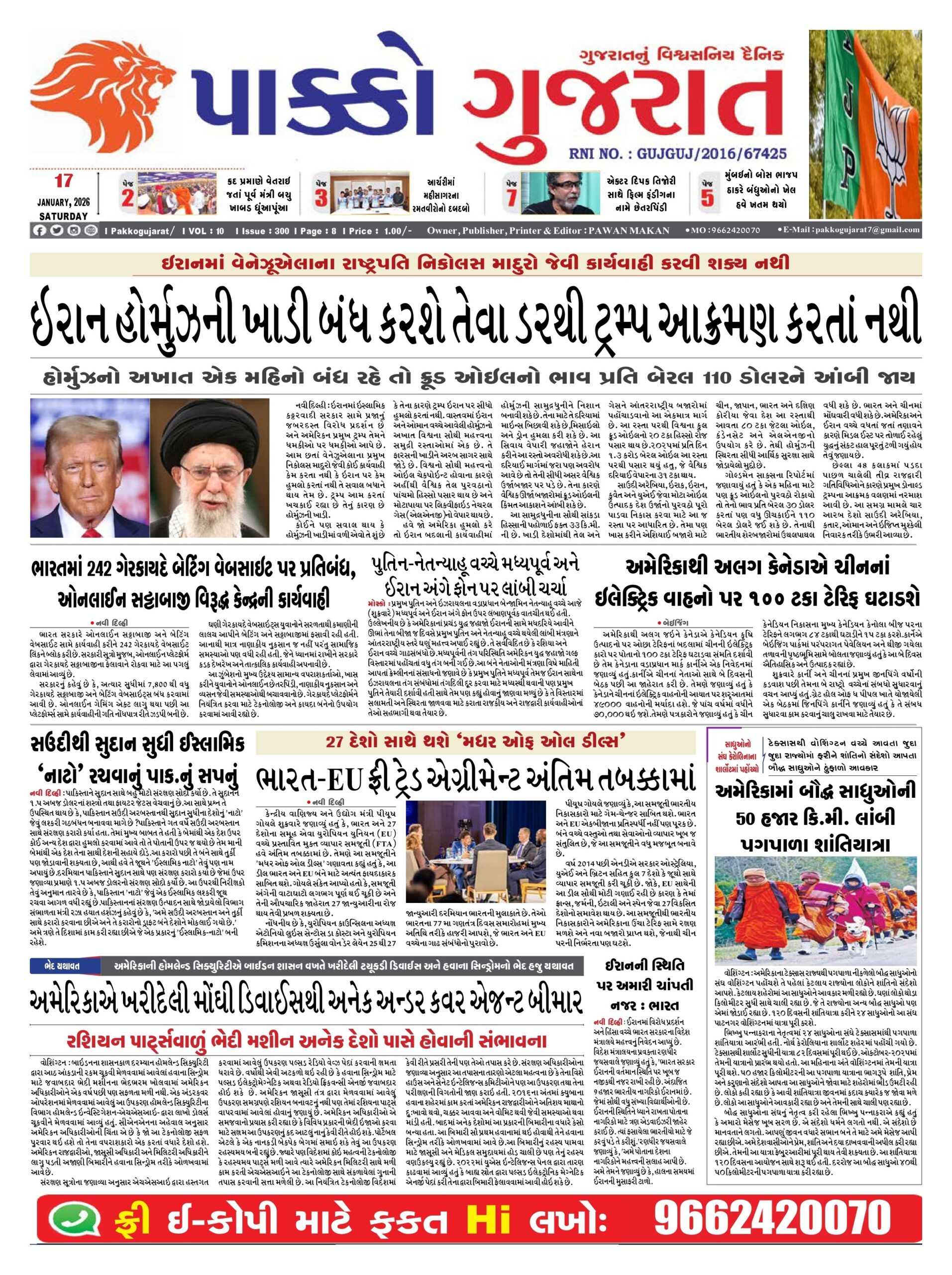 HomeepaperPAKKO GUJARAT : 17-01-2026 PAKKO GUJARAT : 17-01-2026 By pakkogujarat January 17, 2026 0 702 Share FacebookTwitterPinterestWhatsApp PAKKO_GUJARAT_17-01-2026Download Share FacebookTwitterPinterestWhatsApp Previous articleGujarat : વલસાડ પોલીસે મહારાષ્ટ્રમાં છુપાયેલા કારના કાચ તોડતી ગેંગના વોન્ટેડ વિનોદ પવારને ઝડપી પાડ્યોNext articleVadodara : ‘ભૂવા’ રાજ, અટલાદરા ચેકપોસ્ટ પાસે રોડ બેસી જતાં કાર ખાડામાં ગરકાવ! pakkogujarathttps://pakkogujarat.com/ RELATED ARTICLES epaper PAKKO GUJARAT : 02-03-2026 March 2, 2026 epaper PAKKO GUJARAT : 01-03-2026 March 1, 2026 epaper PAKKO GUJARAT : 28-02-2026 February 28, 2026 LEAVE A REPLY Cancel reply Comment: Please enter your comment! Name:* Please enter your name here Email:* You have entered an incorrect email address! Please enter your email address here Website: Save my name, email, and website in this browser for the next time I comment. - Advertisment - Most Popular Entertainment : ‘મારે ઘરે જવું છે…’, યુદ્ધ વચ્ચે અબુ ધાબીમાં ફસાઈ બોલિવૂડ એક્ટ્રેસ, UAE સરકારના કર્યા વખાણ March 2, 2026 Valsad : વાપીમાં રીક્ષામાંથી 13.730 કિલોગ્રામ ગાંજાનો જથ્થો પકડાયો : પાંચની ધરપકડ, બે વોન્ટેડ March 2, 2026 National : ખામેનેઈના મોત મુદ્દે જમ્મુ-કાશ્મીરમાં હિંસક દેખાવો, ટોળાને વિખેરવા લાઠીચાર્જ, ટિયર ગેસના શેલ છોડ્યા March 2, 2026 Delhi : ઈરાન-અમેરિકા યુદ્ધની અસરને પગલે અમેરિકન દૂતાવાસ ખાતે સુરક્ષા વધારી દેવાઈ, ચુસ્ત બંદોબસ્ત ગોઠવાયો March 2, 2026 Load more Recent Comments