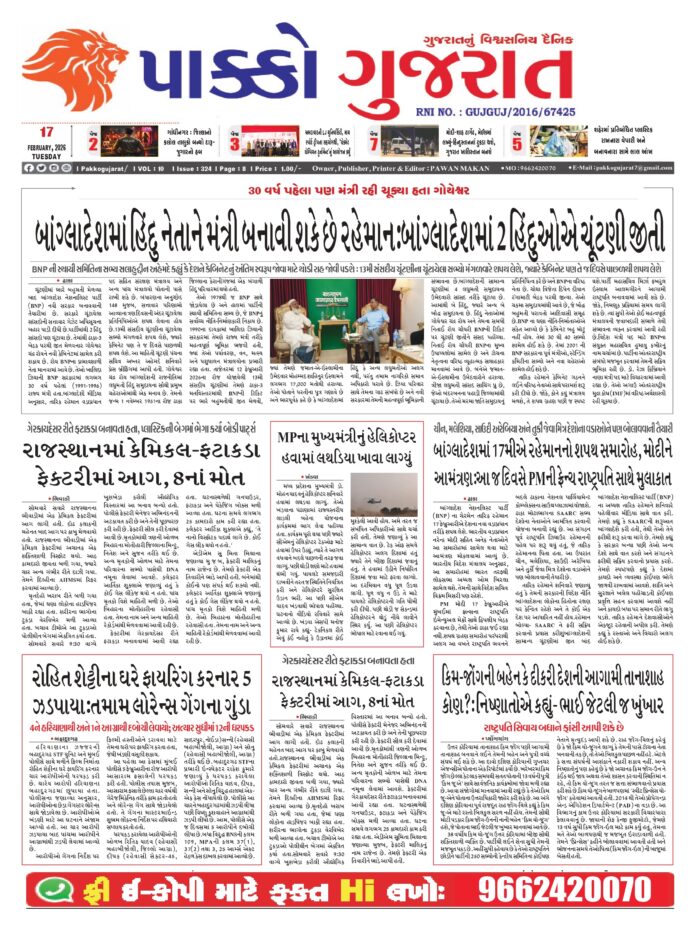 HomeepaperPAKKO GUJARAT : 17-02-2026 PAKKO GUJARAT : 17-02-2026 By pakkogujarat February 17, 2026 0 822 Share FacebookTwitterPinterestWhatsApp PAKKO_GUJARAT_17-02-2026Download Share FacebookTwitterPinterestWhatsApp Previous articleGujarat : થરાદ ટાઉનમાં માદક પદાર્થ મેફેડ્રોન સાથે બે ઈસમોની ધરપકડNext articleBollywood : દર્શન રાવલ નું ‘સાથિયા’ રિલીઝ પહેલાં જ હિટ, લાઇવ પરફોર્મન્સે જીત્યાં દિલ pakkogujarathttps://pakkogujarat.com/ RELATED ARTICLES epaper PAKKO GUJARAT : 02-03-2026 March 2, 2026 epaper PAKKO GUJARAT : 01-03-2026 March 1, 2026 epaper PAKKO GUJARAT : 28-02-2026 February 28, 2026 LEAVE A REPLY Cancel reply Comment: Please enter your comment! Name:* Please enter your name here Email:* You have entered an incorrect email address! Please enter your email address here Website: Save my name, email, and website in this browser for the next time I comment. - Advertisment - Most Popular National : ખામેનેઈના મોત મુદ્દે જમ્મુ-કાશ્મીરમાં હિંસક દેખાવો, ટોળાને વિખેરવા લાઠીચાર્જ, ટિયર ગેસના શેલ છોડ્યા March 2, 2026 Delhi : ઈરાન-અમેરિકા યુદ્ધની અસરને પગલે અમેરિકન દૂતાવાસ ખાતે સુરક્ષા વધારી દેવાઈ, ચુસ્ત બંદોબસ્ત ગોઠવાયો March 2, 2026 National : 11 घंटे बंद रहेगा राम मंदिर, जानें कब खुलेगा राम लला का द्वार? March 2, 2026 Gujarat : માઉન્ટ આબુ ખાતે રાજ્ય સરકાર યોજશે નિ:શુલ્ક પર્વતારોહણ તાલીમ, રહેવા-જમવા સહિતની સુવિધા ફ્રી March 2, 2026 Load more Recent Comments