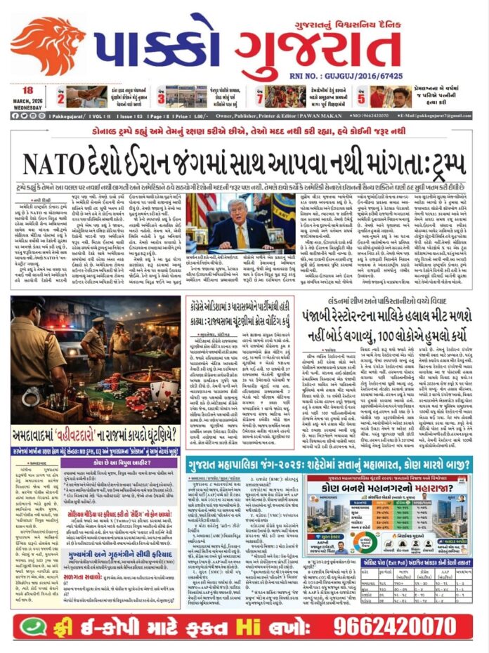 HomeepaperPAKKO GUJARAT : 18-03-2026 PAKKO GUJARAT : 18-03-2026 By pakkogujarat March 18, 2026 0 991 Share FacebookXPinterestWhatsApp PAKKO_GUJARAT_18-03-2026Download Share FacebookXPinterestWhatsApp Previous articleGujarat : ગુજરાત મહાપાલિકા જંગ-૨૦૨૬: શહેરોમાં સત્તાનું મહાભારત, કોણ મારશે બાજી?Next articleArticle : સુનીલ ગ્રોવર: અભિનયનો જાદુગર અને નસીબની આટીઘૂંટી pakkogujarathttps://pakkogujarat.com/ RELATED ARTICLES epaper PAKKO GUJARAT : 02-04-2026 April 2, 2026 epaper PAKKO GUJARAT : 01-04-2026 April 1, 2026 epaper PAKKO GUJARAT : 31-03-2026 March 31, 2026 LEAVE A REPLY Cancel reply Comment: Please enter your comment! Name:* Please enter your name here Email:* You have entered an incorrect email address! Please enter your email address here Website: Save my name, email, and website in this browser for the next time I comment. - Advertisment - Most Popular Vadodara : ભાયલી ટીપી ૩ અને ૪નો સમગ્ર વિસ્તાર અશાંતધારામાં સમાવેશ April 3, 2026 World : ટ્રમ્પની ફાઇનલ વોર્નિંગ સામે ઇરાને મિસાઇલ એટેક કરતાં સ્થિતિ વિસ્ફોટક April 3, 2026 National : હવાઈ મુસાફરોને ફટકો: 60 ટકા સીટની મફતમાં પસંદગી કરવાના નિર્ણય પર કેન્દ્ર સરકારની રોક April 3, 2026 Gandhinagar : વિધિના બહાને વિશ્વાસઘાત ઃ બે વૃદ્ધાના ૨૭ લાખના દાગીના લઈ ઠગ ટોળકી ફરાર April 3, 2026 Load more Recent Comments