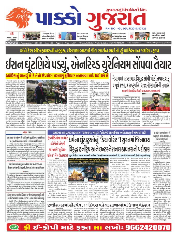 HomeepaperPAKKO GUJARAT : 18-04-2026 PAKKO GUJARAT : 18-04-2026 By pakkogujarat April 18, 2026 0 1248 Share FacebookXPinterestWhatsApp PAKKO_GUJARAT_18-04-2026Download Share FacebookXPinterestWhatsApp Previous articleRashi : 18 એપ્રિલ 2026નું રાશિ ભવિષ્યNext articleNational : ઈઝરાયલ-લેબેનોન વચ્ચે 10 દિવસનું યુદ્ધવિરામ, ટ્રમ્પે કરી જાહેરાત; 34 વર્ષ બાદ આમને-સામને વાતચીત pakkogujarathttps://pakkogujarat.com/ RELATED ARTICLES epaper PAKKO GUJARAT : 20-04-2026 April 20, 2026 epaper PAKKO GUJARAT : 19-04-2026 April 19, 2026 epaper PAKKO GUJARAT : 17-04-2026 April 17, 2026 LEAVE A REPLY Cancel reply Comment: Please enter your comment! Name:* Please enter your name here Email:* You have entered an incorrect email address! Please enter your email address here Website: Save my name, email, and website in this browser for the next time I comment. - Advertisment - Most Popular National : મહિલા અનામત બિલ પર પીએમ મોદીએ તમામ પક્ષોને પત્ર લખ્યો, ખડગેએ કહ્યું – અમને વિશ્વાસમાં લીધા વિના… April 20, 2026 National : જ્યારે પણ ભય અને ભ્રષ્ટાચાર ચરમસીમાએ પહોંચે છે, ત્યારે લોકો ભાજપ પર વિશ્વાસ કરે છે: પીએમ મોદી April 20, 2026 National : “અમે કોઈને છેડતા નથી, અને જો કોઈ અમને છેડશે, તો અમે તેમને જવા દેતા નથી,” સંરક્ષણ પ્રધાન રાજનાથ સિંહે ઓપરેશન સિંદૂર પર... April 20, 2026 National : પ્રોટોકોલ તોડીને, પીએમ મોદી જનતા સુધી પહોંચ્યા અને એક દુકાનમાં ઝાલમુરીનો સ્વાદ ચાખ્યો. April 20, 2026 Load more Recent Comments