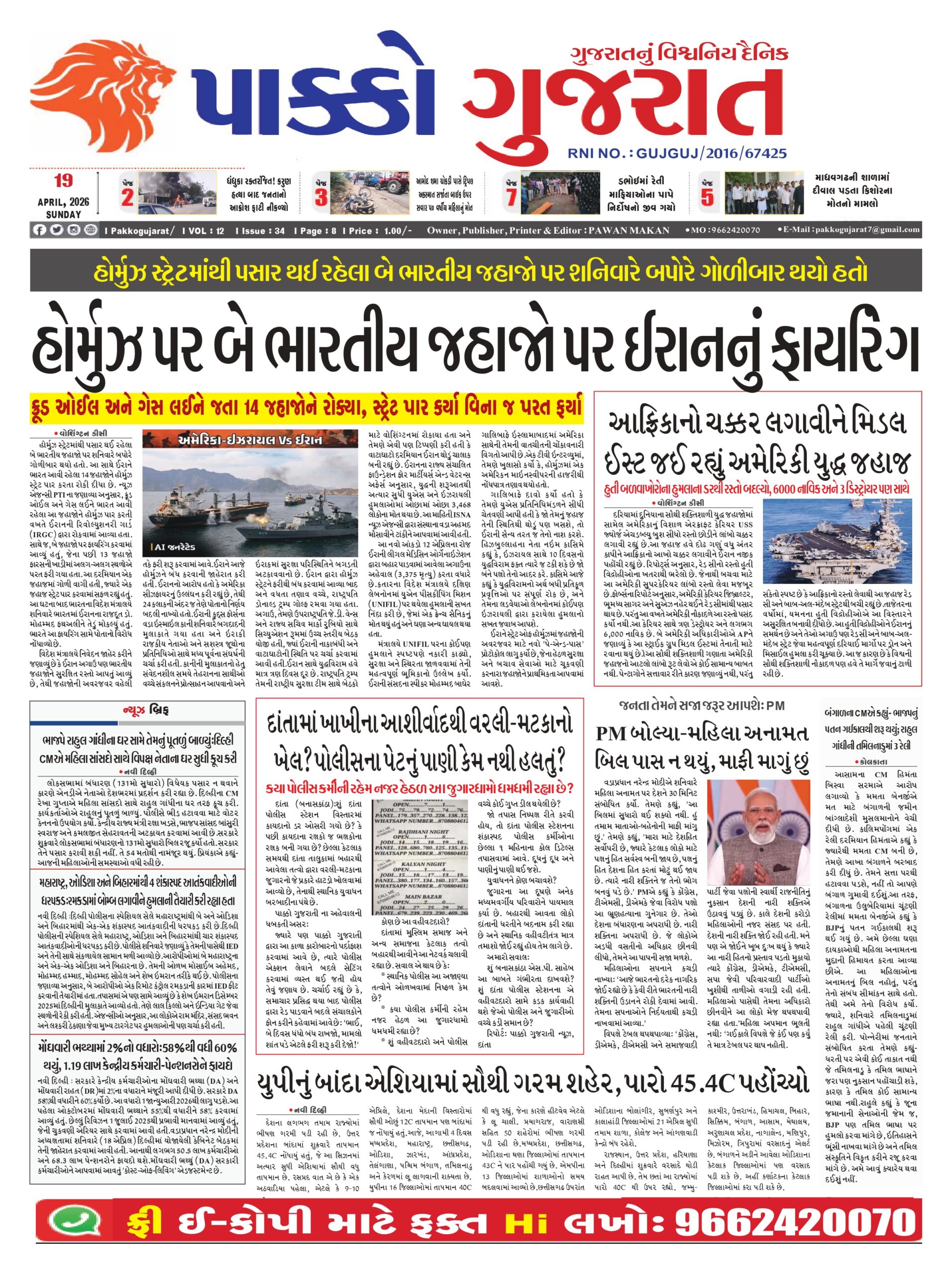 HomeepaperPAKKO GUJARAT : 19-04-2026 PAKKO GUJARAT : 19-04-2026 By pakkogujarat April 19, 2026 0 1253 Share FacebookXPinterestWhatsApp PAKKO_GUJARAT_19-04-2026Download Share FacebookXPinterestWhatsApp Previous articleRashi : 19 એપ્રિલ 2026નું રાશિ ભવિષ્યNext articleArticle : ચૌદવી કા ચાંદ: હિન્દી સિનેમામાં ‘મુસ્લિમ સોશિયલ’ ફિલ્મોના ઉદયની અમર ગાથા pakkogujarathttps://pakkogujarat.com/ RELATED ARTICLES epaper PAKKO GUJARAT : 18-04-2026 April 18, 2026 epaper PAKKO GUJARAT : 17-04-2026 April 17, 2026 epaper PAKKO GUJARAT : 16-04-2026 April 16, 2026 LEAVE A REPLY Cancel reply Comment: Please enter your comment! Name:* Please enter your name here Email:* You have entered an incorrect email address! Please enter your email address here Website: Save my name, email, and website in this browser for the next time I comment. - Advertisment - Most Popular National : બંધારણ બિલનો પરાજય થતાં જ NDA આક્રમક બન્યું: વિપક્ષી સાંસદોને ઘેરવાની યોજના બનાવી, રસ્તાઓથી લઈને સોશિયલ મીડિયા સુધી પ્રચાર ચાલશે April 19, 2026 National : ‘છેતરપિંડી, છેતરપિંડી અને પાપ’: સુધારા વિરોધીથી નકારાત્મક રાજકારણ સુધી, પીએમ મોદીએ કોંગ્રેસ પર આકરા પ્રહારો કર્યા April 19, 2026 National : “કોંગ્રેસે અંગ્રેજોની ‘ભાગલા પાડો અને રાજ કરો’ની નીતિ અપનાવી”: સીમાંકન મુદ્દે જૂઠ ફેલાવવા બદલ PMનો વળતો પ્રહાર April 19, 2026 National : ‘માત્ર સમયની રાહ જોઈ રહ્યો છું’: મહિલા અનામત અંગે ભવિષ્યની રણનીતિ અંગે પીએમ મોદીએ સંકેત આપ્યો, કહ્યું કે ગઈકાલે તેમની પાસે આંકડા... April 19, 2026 Load more Recent Comments