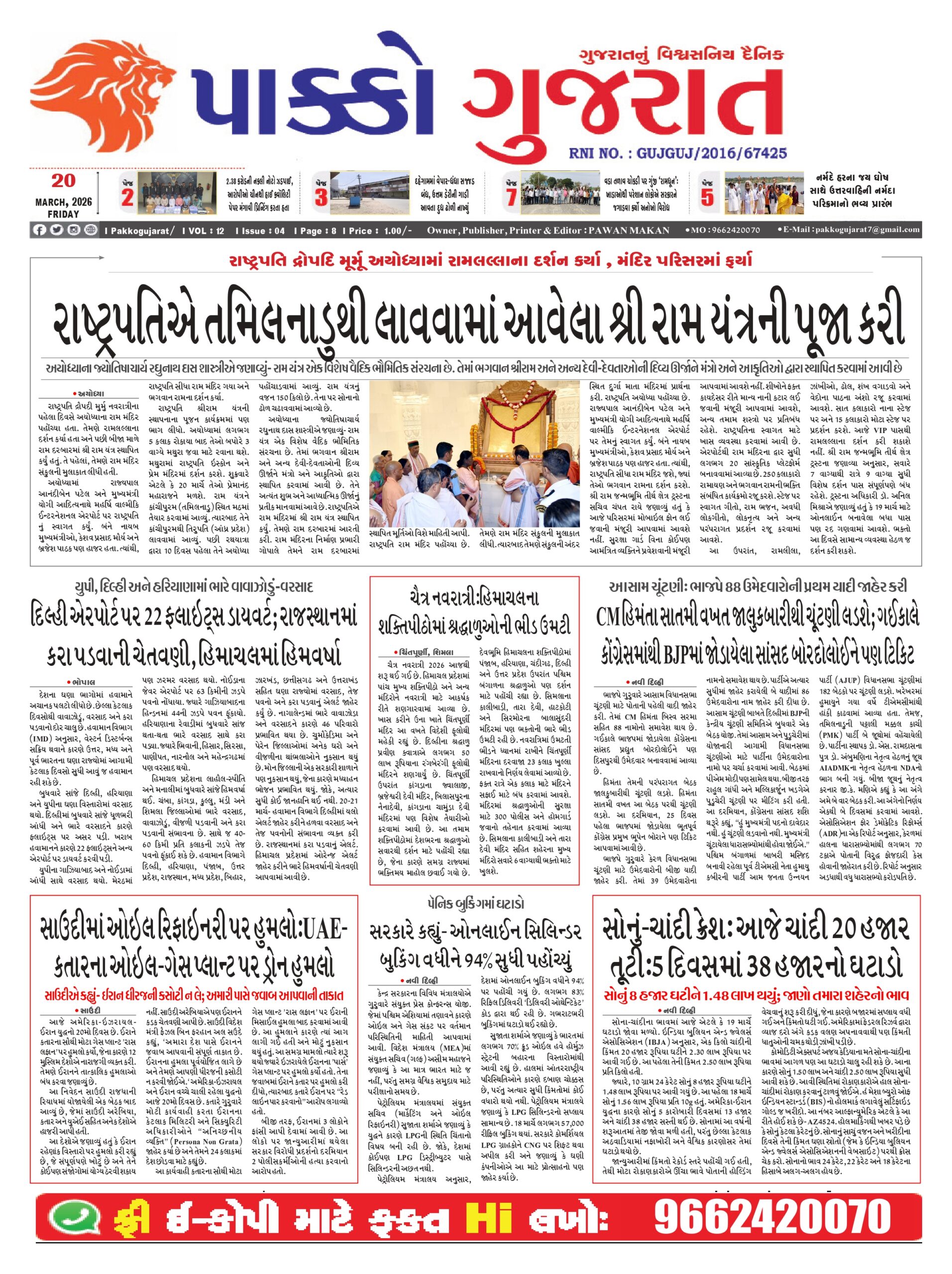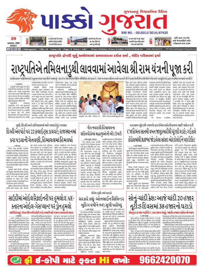 HomeepaperPAKKO GUJARAT : 20-03-2026 PAKKO GUJARAT : 20-03-2026 By pakkogujarat March 20, 2026 0 1014 Share FacebookXPinterestWhatsApp PAKKO_GUJARAT_20-03-2026Download Share FacebookXPinterestWhatsApp Previous articleRashi : 20 માર્ચ 2026નું રાશિ ભવિષ્યNext articleAhmedabad : મહિલા પગના દુખાવાની સારવાર કરાવવા ગઇ અને ડીગ્રી વિનાના યુવકે કમરનો બોલ તોડ્યો pakkogujarathttps://pakkogujarat.com/ RELATED ARTICLES epaper PAKKO GUJARAT : 02-04-2026 April 2, 2026 epaper PAKKO GUJARAT : 01-04-2026 April 1, 2026 epaper PAKKO GUJARAT : 31-03-2026 March 31, 2026 LEAVE A REPLY Cancel reply Comment: Please enter your comment! Name:* Please enter your name here Email:* You have entered an incorrect email address! Please enter your email address here Website: Save my name, email, and website in this browser for the next time I comment. - Advertisment - Most Popular National : મોંઘવારીએ માઝા મૂકી : પેટ્રોલ, ડીઝલ, ગેસ, વિમાન ભાડું… બધું મોંઘુ April 2, 2026 Business : સોનામાં રૂ.4000, ચાંદીમાં 6000ની તેજી: ડોલર તૂટીને 93.30 બોલાયો April 2, 2026 Top News : અમે ઈરાન પર 2-3 અઠવાડિયા ભયાનક હુમલા કરીશું, તેને પાષાણ યુગમાં ધકેલી દઇશું : ટ્રમ્પ April 2, 2026 9 બોલમાં 0 અને પછી 47 બોલમાં 70 રન… કોણ છે સમીર રિઝવી જેણે એકલા હાથે બાજી પલટી April 2, 2026 Load more Recent Comments