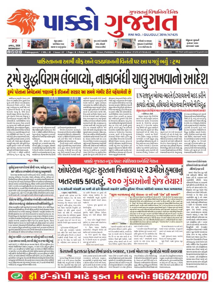 HomeepaperPAKKO GUJARAT : 22-04-2026 PAKKO GUJARAT : 22-04-2026 By pakkogujarat April 22, 2026 0 1275 Share FacebookXPinterestWhatsApp PAKKO_GUJARAT_22-04-2026Download Share FacebookXPinterestWhatsApp Previous articleKerala : ફટાકડાની ફેક્ટરીમાં મોટો બ્લાસ્ટ, 5થી વધુ લોકોના મોત, 35થી વધુ લોકો ઘાયલNext articleRashi : 22 એપ્રિલ 2026નું રાશિ ભવિષ્ય pakkogujarathttps://pakkogujarat.com/ RELATED ARTICLES epaper PAKKO GUJARAT : 21-04-2026 April 21, 2026 epaper PAKKO GUJARAT : 20-04-2026 April 20, 2026 epaper PAKKO GUJARAT : 19-04-2026 April 19, 2026 LEAVE A REPLY Cancel reply Comment: Please enter your comment! Name:* Please enter your name here Email:* You have entered an incorrect email address! Please enter your email address here Website: Save my name, email, and website in this browser for the next time I comment. - Advertisment - Most Popular National : એક નિવૃત્ત સેના કર્મચારી ડિફેન્સ કેન્ટીનમાંથી દારૂ લાવ્યા પછી તેને વધુ કિંમતે વેચી રહ્યો હતો, જે એક્સાઇઝ વિભાગની મોટી કાર્યવાહી છે. April 22, 2026 National : 22 એપ્રિલે આતંકવાદીઓએ પહેલગામને કેવી રીતે હચમચાવી નાખ્યું: આતંકવાદીઓ ક્યાં ભાગી ગયા, સુરક્ષા દળો તેમને કેમ રોકી શક્યા નહીં, બધું જાણો. April 22, 2026 National : બિલ પરાજિત થયા બાદ કોંગ્રેસે પીએમ મોદી વિરુદ્ધ સ્પીકરને નોટિસ ફટકારી, સાંસદોનું અપમાન કરવાનો આરોપ લગાવ્યો April 22, 2026 National : ‘ખડગેએ બધી હદ વટાવી દીધી છે’, પીએમ પરના વિવાદાસ્પદ નિવેદન પર શાહે કોંગ્રેસ અધ્યક્ષ પર પ્રહાર કર્યા April 22, 2026 Load more Recent Comments