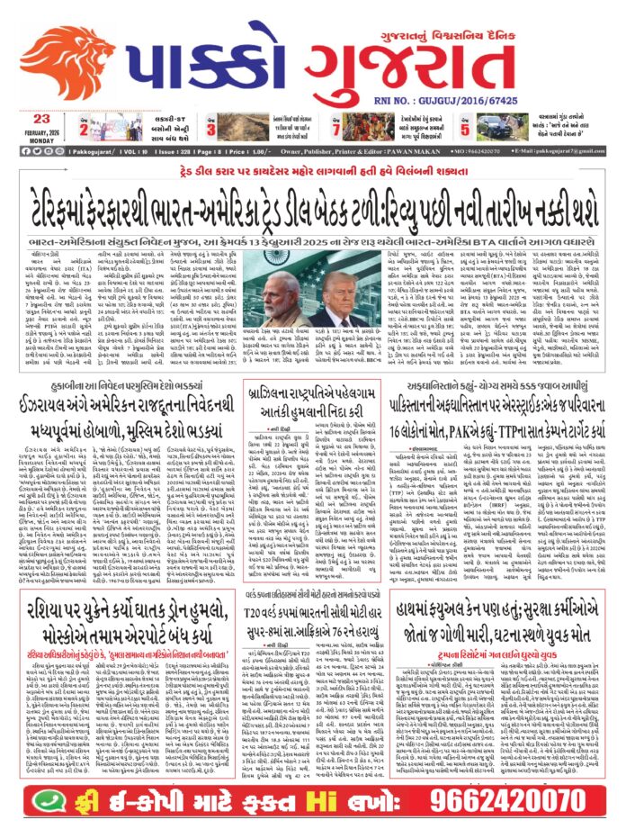 HomeepaperPAKKO GUJARAT : 23-02-2026 PAKKO GUJARAT : 23-02-2026 By pakkogujarat February 23, 2026 0 844 Share FacebookTwitterPinterestWhatsApp PAKKO_GUJARAT_23-02-2026Download Share FacebookTwitterPinterestWhatsApp Previous articleRashi : 23 ફેબ્રુઆરી, 2026નું રાશિ ભવિષ્યNext articleGujarat : હવે રાજ્યના ઝેરી સાપોમાંથી જ બનશે સર્પદંશ વિરોધી રસી, ધરમપુરની SRI દેશની બીજી એવી સંસ્થા pakkogujarathttps://pakkogujarat.com/ RELATED ARTICLES epaper PAKKO GUJARAT : 02-03-2026 March 2, 2026 epaper PAKKO GUJARAT : 01-03-2026 March 1, 2026 epaper PAKKO GUJARAT : 28-02-2026 February 28, 2026 LEAVE A REPLY Cancel reply Comment: Please enter your comment! Name:* Please enter your name here Email:* You have entered an incorrect email address! Please enter your email address here Website: Save my name, email, and website in this browser for the next time I comment. - Advertisment - Most Popular National : ખામેનેઈના મોત મુદ્દે જમ્મુ-કાશ્મીરમાં હિંસક દેખાવો, ટોળાને વિખેરવા લાઠીચાર્જ, ટિયર ગેસના શેલ છોડ્યા March 2, 2026 Delhi : ઈરાન-અમેરિકા યુદ્ધની અસરને પગલે અમેરિકન દૂતાવાસ ખાતે સુરક્ષા વધારી દેવાઈ, ચુસ્ત બંદોબસ્ત ગોઠવાયો March 2, 2026 National : 11 घंटे बंद रहेगा राम मंदिर, जानें कब खुलेगा राम लला का द्वार? March 2, 2026 Gujarat : માઉન્ટ આબુ ખાતે રાજ્ય સરકાર યોજશે નિ:શુલ્ક પર્વતારોહણ તાલીમ, રહેવા-જમવા સહિતની સુવિધા ફ્રી March 2, 2026 Load more Recent Comments