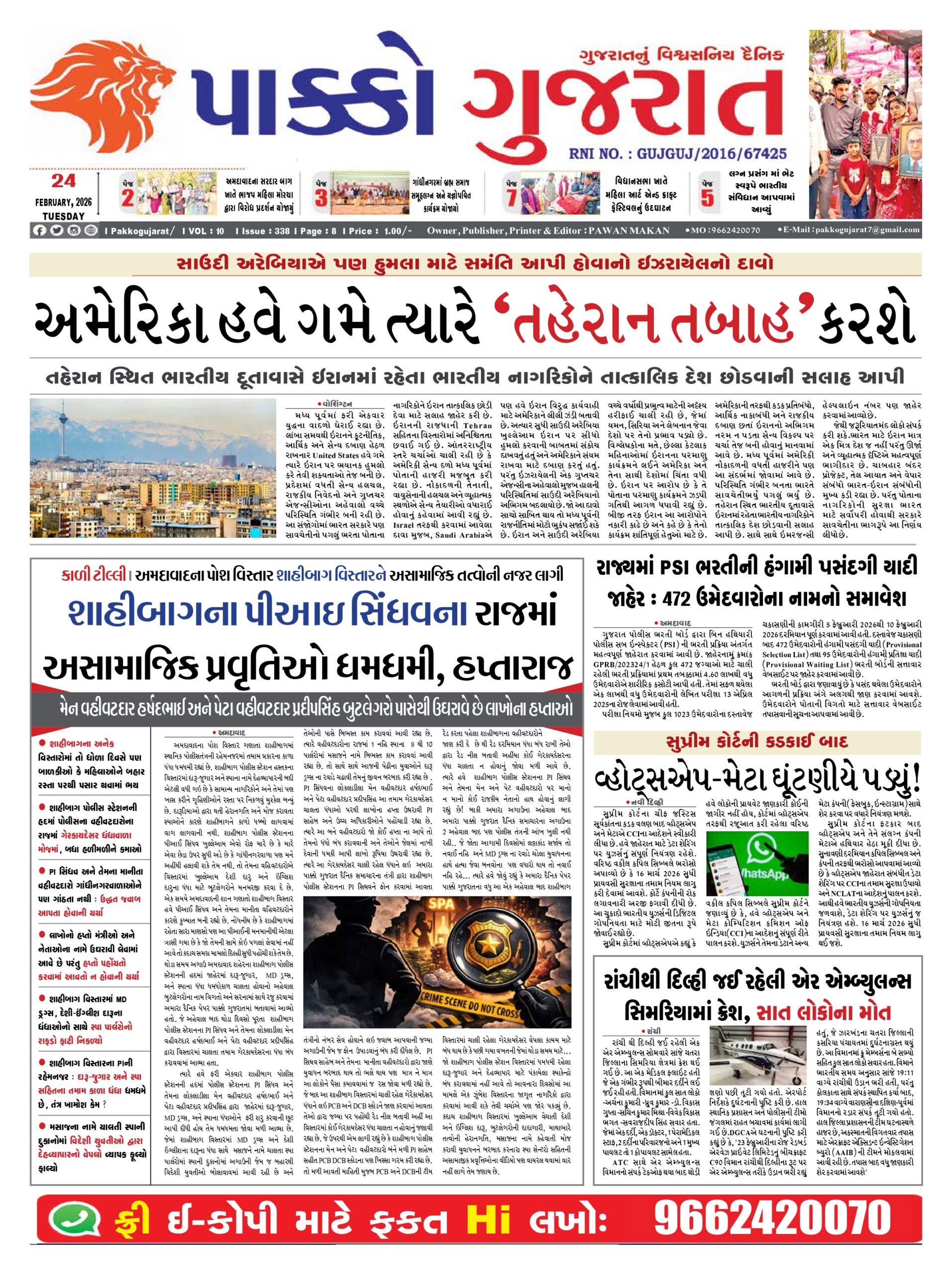 HomeepaperPAKKO GUJARAT : 24-02-2026 PAKKO GUJARAT : 24-02-2026 By pakkogujarat February 24, 2026 0 848 Share FacebookTwitterPinterestWhatsApp પાક્કો ગુજરાત 24-02-2026Download Share FacebookTwitterPinterestWhatsApp Previous articleArticle : ગુજરાતના મુક સેવક: પૂજનીય રવિશંકર મહારાજNext articleAhmedabad : પેસેન્જરના સ્વાંગમાં બેઠેલા લૂંટારુઓએ માર મારી રિક્ષા ચાલકને લૂંટી લીધો pakkogujarathttps://pakkogujarat.com/ RELATED ARTICLES epaper PAKKO GUJARAT : 02-03-2026 March 2, 2026 epaper PAKKO GUJARAT : 01-03-2026 March 1, 2026 epaper PAKKO GUJARAT : 28-02-2026 February 28, 2026 LEAVE A REPLY Cancel reply Comment: Please enter your comment! Name:* Please enter your name here Email:* You have entered an incorrect email address! Please enter your email address here Website: Save my name, email, and website in this browser for the next time I comment. - Advertisment - Most Popular Surat : ગુજરાતનું એક એવું ગામ જ્યાં નૃસિંહ ભગવાનના મંદિરે પૂજા કર્યા બાદ જ પ્રગટે છે હોળી March 2, 2026 Gandhinagar : હર્ષ સંઘવી અને ગીફ્ટ સિટીના નવા ચેરમેન ઉદય કોટક વચ્ચે સૌજન્ય મુલાકાત March 2, 2026 Ahmedabad : રામોલમાં કોલેજિયન યુવતી સાથે 6 લાખની છેતરપિંડી થઈ છે. ફોર એવર લિવિંગ પ્રોડક્ટમાં રોકાણના નામે મિત્રએ 6 લાખના દાગીના પડાવ્યા March 2, 2026 Entertainment : કિયારા અડવાણી અને યશની જોડીનો જાદુ! ટૉક્સિકના પહેલા ગીતે ઇન્ટરનેટ પર મચાવ્યો ખળભળાટ! March 2, 2026 Load more Recent Comments