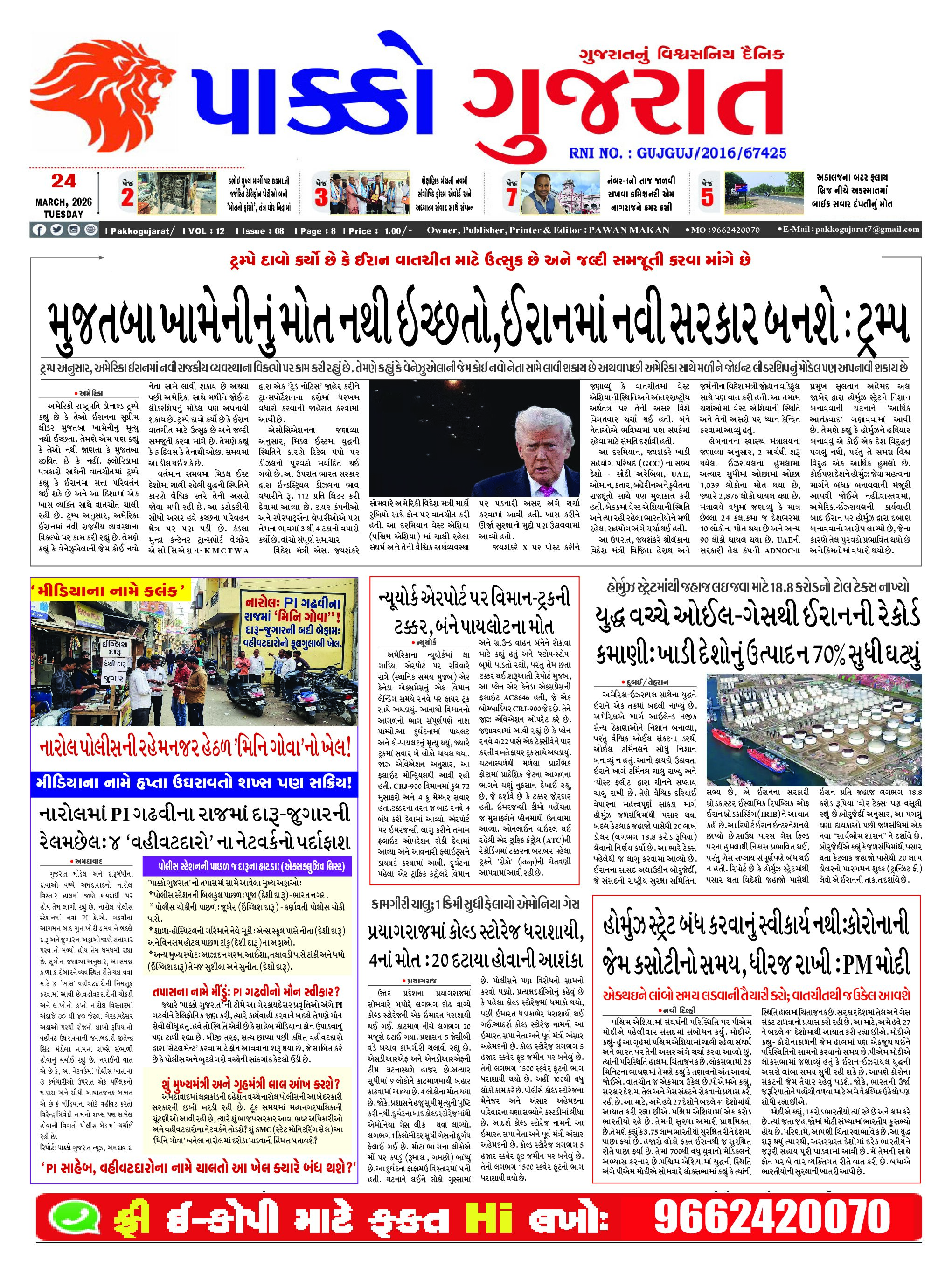 HomeepaperPAKKO GUJARAT : 24-03-2026 PAKKO GUJARAT : 24-03-2026 By pakkogujarat March 24, 2026 0 1044 Share FacebookXPinterestWhatsApp PAKKO_GUJARAT_24-03-2026Download Share FacebookXPinterestWhatsApp Previous articleKutch : ભુજમાં પેટ્રોલ-ડીઝલની અછત, બે પંપો થયા બંધNext articleRashifal : આજ ના રાશિફળ pakkogujarathttps://pakkogujarat.com/ RELATED ARTICLES epaper PAKKO GUJARAT : 03-04-2026 April 3, 2026 epaper PAKKO GUJARAT : 02-04-2026 April 2, 2026 epaper PAKKO GUJARAT : 01-04-2026 April 1, 2026 LEAVE A REPLY Cancel reply Comment: Please enter your comment! Name:* Please enter your name here Email:* You have entered an incorrect email address! Please enter your email address here Website: Save my name, email, and website in this browser for the next time I comment. - Advertisment - Most Popular Gujarat : સતત બીજા દિવસે દેવભૂમિ દ્વારકામાં કમોસમી વરસાદ, 9 જિલ્લામાં ઍલર્ટ જાહેર April 3, 2026 Gujarat : સાણંદમાં વૃદ્ધોને રિક્ષામાં બેસાડી લૂંટ ચલાવતી ગેંગ ઝડપાઈ, એક મહિલા સહિત 4ની ધરપકડ April 3, 2026 Bollywood : અજય દેવગણે નવી ફિલ્મ માટે ફરી ઓમ રાઉત સાથે હાથ મિલાવ્યા April 3, 2026 Bollywood : પબ્લિસિટી માટે ભૂતબંગલા છ દિવસ પાછી ઠેલવાનું ગતકડું April 3, 2026 Load more Recent Comments