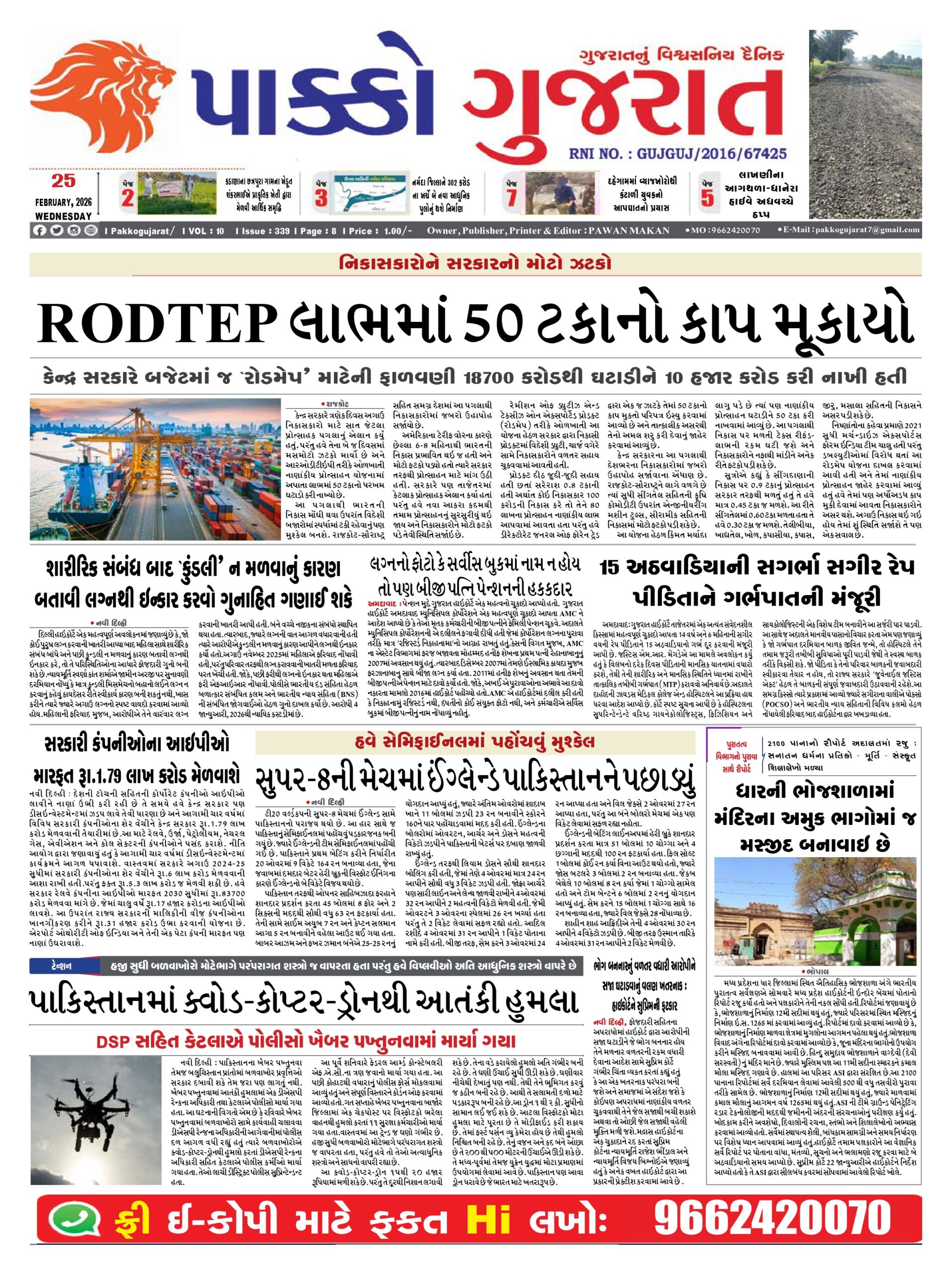 HomeepaperPAKKO GUJARAT : 25-02-2026 PAKKO GUJARAT : 25-02-2026 By pakkogujarat February 25, 2026 0 854 Share FacebookTwitterPinterestWhatsApp પાક્કો ગુજરાત 25-02-2026Download Share FacebookTwitterPinterestWhatsApp Previous articleRashi : 25 ફેબ્રુઆરી 2026નું રાશિ ભવિષ્યNext articleNational : स्कूली बच्चों के दुपहिया वाहन चलाने पर प्रतिबंध लगाने की मांग. pakkogujarathttps://pakkogujarat.com/ RELATED ARTICLES epaper PAKKO GUJARAT : 02-03-2026 March 2, 2026 epaper PAKKO GUJARAT : 01-03-2026 March 1, 2026 epaper PAKKO GUJARAT : 28-02-2026 February 28, 2026 LEAVE A REPLY Cancel reply Comment: Please enter your comment! Name:* Please enter your name here Email:* You have entered an incorrect email address! Please enter your email address here Website: Save my name, email, and website in this browser for the next time I comment. - Advertisment - Most Popular National : ખામેનેઈના મોત મુદ્દે જમ્મુ-કાશ્મીરમાં હિંસક દેખાવો, ટોળાને વિખેરવા લાઠીચાર્જ, ટિયર ગેસના શેલ છોડ્યા March 2, 2026 Delhi : ઈરાન-અમેરિકા યુદ્ધની અસરને પગલે અમેરિકન દૂતાવાસ ખાતે સુરક્ષા વધારી દેવાઈ, ચુસ્ત બંદોબસ્ત ગોઠવાયો March 2, 2026 National : 11 घंटे बंद रहेगा राम मंदिर, जानें कब खुलेगा राम लला का द्वार? March 2, 2026 Gujarat : માઉન્ટ આબુ ખાતે રાજ્ય સરકાર યોજશે નિ:શુલ્ક પર્વતારોહણ તાલીમ, રહેવા-જમવા સહિતની સુવિધા ફ્રી March 2, 2026 Load more Recent Comments