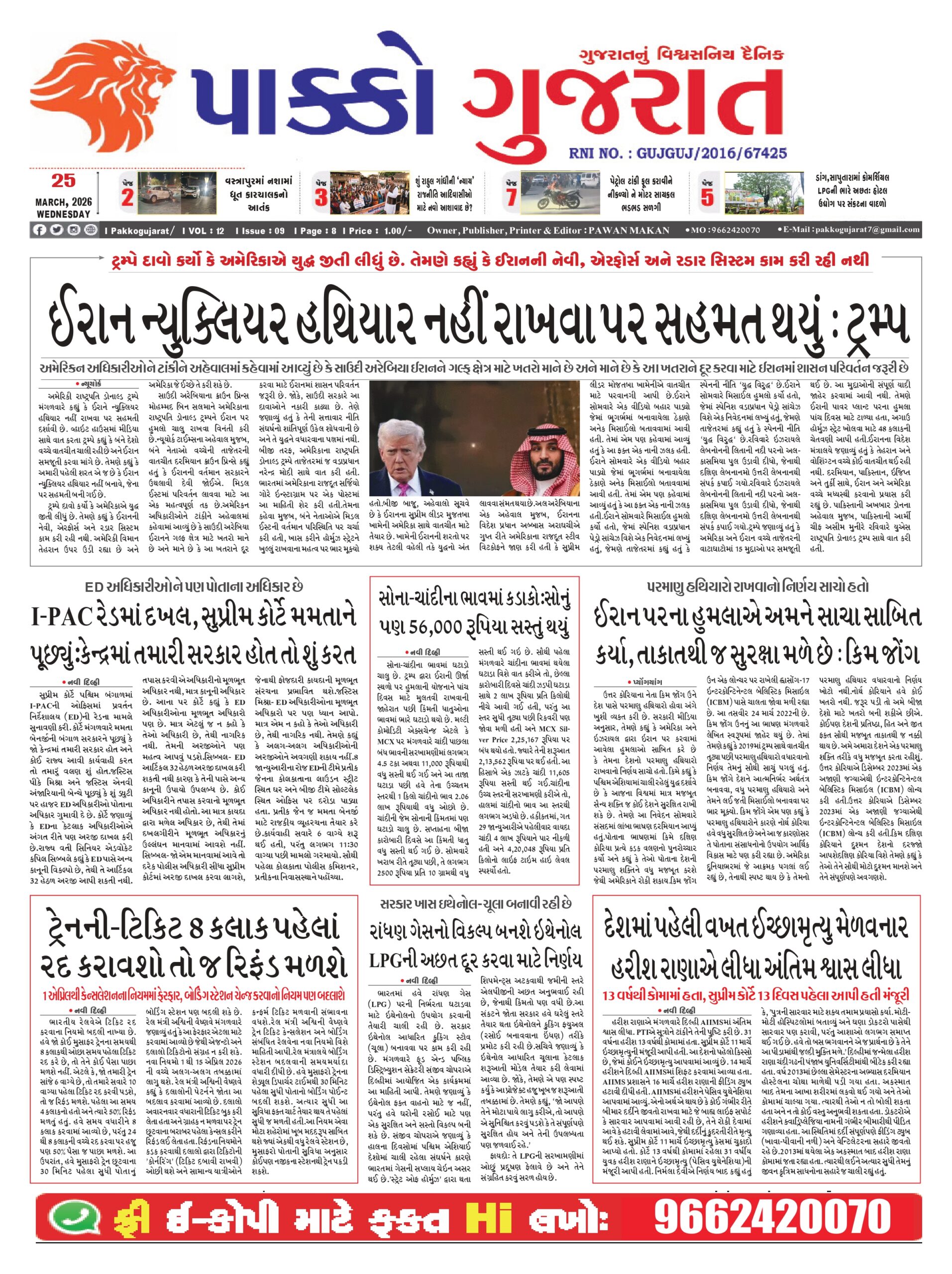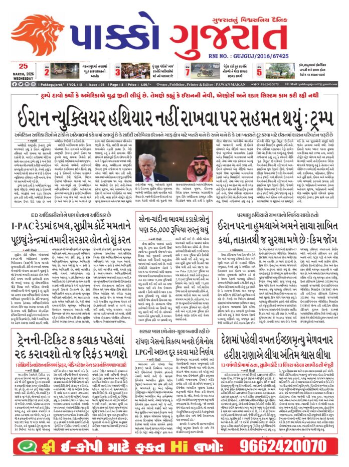 HomeepaperPAKKO GUJARAT : 25-03-2026 PAKKO GUJARAT : 25-03-2026 By pakkogujarat March 25, 2026 0 1049 Share FacebookXPinterestWhatsApp PAKKO_GUJARAT_25-03-2026Download Share FacebookXPinterestWhatsApp Previous articleArticle : શું તમે પણ દુનિયા માટે એક ‘Hot Topic’ બનવા તૈયાર છો?Next articleGujarat : અંબાલાલ પટેલ: જેની આગાહી પર ખેડૂતોને ભરોસો હતો, આજે દુનિયાએ માનવું પડ્યું! જાણો ઈરાન-અમેરિકા યુદ્ધવિરામ પાછળનું શું છે ‘અંબાલાલી ગણિત’ pakkogujarathttps://pakkogujarat.com/ RELATED ARTICLES epaper PAKKO GUJARAT : 02-04-2026 April 2, 2026 epaper PAKKO GUJARAT : 01-04-2026 April 1, 2026 epaper PAKKO GUJARAT : 31-03-2026 March 31, 2026 LEAVE A REPLY Cancel reply Comment: Please enter your comment! Name:* Please enter your name here Email:* You have entered an incorrect email address! Please enter your email address here Website: Save my name, email, and website in this browser for the next time I comment. - Advertisment - Most Popular National : રશિયન કન્યાઓનું દિલ હવે ભારતીય ‘દેશી બોયઝ’ પર ફિદા! જાણો કેમ રશિયાની છોકરીઓને ગમે છે ભારતીય છોકરાઓ?મોસ્કોથી મુંબઈ સુધીની પ્રેમ કહાની: રશિયામાં... April 2, 2026 Article : સત્તાનો સંગ્રામ: લોકશાહીના ફલક પર મોદીનું ‘અજેય’ મિશન vs રાહુલનું ‘જન’ આંદોલન April 2, 2026 Vadodara : વિરોદ ગામે ઘર સુધી આવી ગયેલા મગરનું દિલધડક રેસ્ક્યુ April 2, 2026 Business : બજાર અસ્થિર છતાં, IPO થકી વિક્રમી ભંડોેળ એકત્ર કરાયું April 2, 2026 Load more Recent Comments