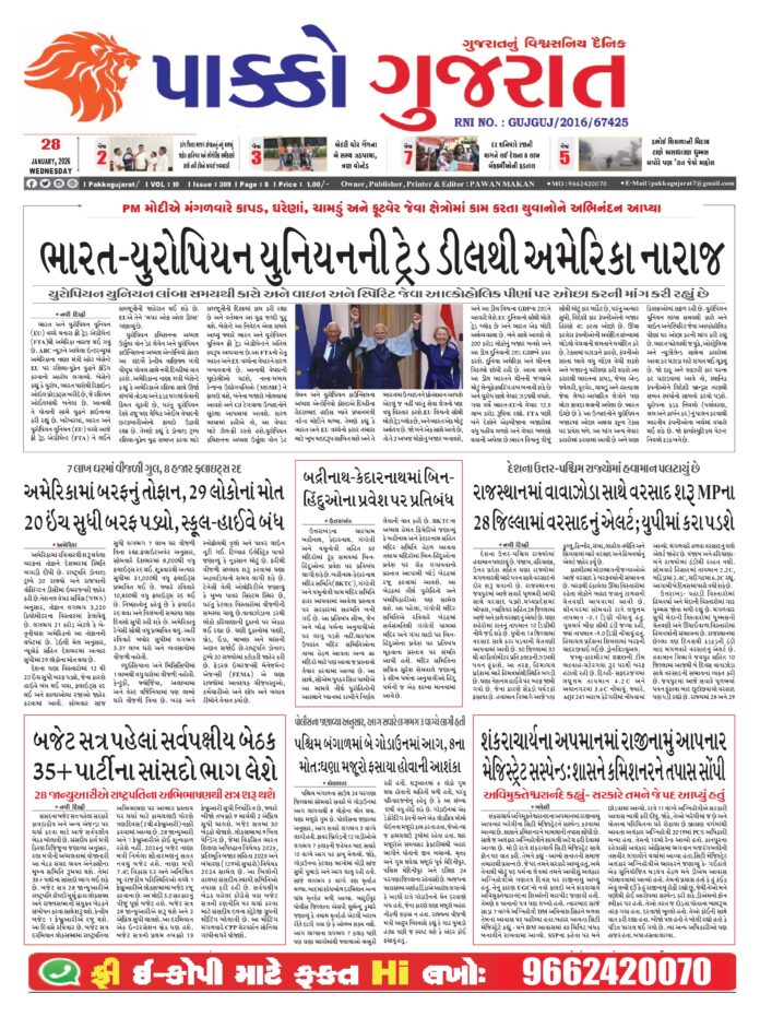 HomeepaperPAKKO GUJARAT : 26-01-2026 PAKKO GUJARAT : 26-01-2026 By pakkogujarat January 28, 2026 0 730 Share FacebookTwitterPinterestWhatsApp PAKKO_GUJARAT_29-01-2026Download Share FacebookTwitterPinterestWhatsApp Previous articleRashi : 28 જાન્યુઆરી 2026નું રાશિ ભવિષ્યNext articleNational : केन्द्रीय कृषि एवं कृषक कल्याण मंत्री शिवराज सिंह चौहान विद्यासागरोदय समाधि स्थल में संत शिरोमणि आचार्य श्री 108 विद्यासागर जी महामुनिराज के द्वितीय समाधि स्मृति महामहोत्सव कार्यक्रम में हुए शामिल pakkogujarathttps://pakkogujarat.com/ RELATED ARTICLES epaper PAKKO GUJARAT : 02-03-2026 March 2, 2026 epaper PAKKO GUJARAT : 01-03-2026 March 1, 2026 epaper PAKKO GUJARAT : 28-02-2026 February 28, 2026 LEAVE A REPLY Cancel reply Comment: Please enter your comment! Name:* Please enter your name here Email:* You have entered an incorrect email address! Please enter your email address here Website: Save my name, email, and website in this browser for the next time I comment. - Advertisment - Most Popular Entertainment : ‘મારે ઘરે જવું છે…’, યુદ્ધ વચ્ચે અબુ ધાબીમાં ફસાઈ બોલિવૂડ એક્ટ્રેસ, UAE સરકારના કર્યા વખાણ March 2, 2026 Valsad : વાપીમાં રીક્ષામાંથી 13.730 કિલોગ્રામ ગાંજાનો જથ્થો પકડાયો : પાંચની ધરપકડ, બે વોન્ટેડ March 2, 2026 National : ખામેનેઈના મોત મુદ્દે જમ્મુ-કાશ્મીરમાં હિંસક દેખાવો, ટોળાને વિખેરવા લાઠીચાર્જ, ટિયર ગેસના શેલ છોડ્યા March 2, 2026 Delhi : ઈરાન-અમેરિકા યુદ્ધની અસરને પગલે અમેરિકન દૂતાવાસ ખાતે સુરક્ષા વધારી દેવાઈ, ચુસ્ત બંદોબસ્ત ગોઠવાયો March 2, 2026 Load more Recent Comments