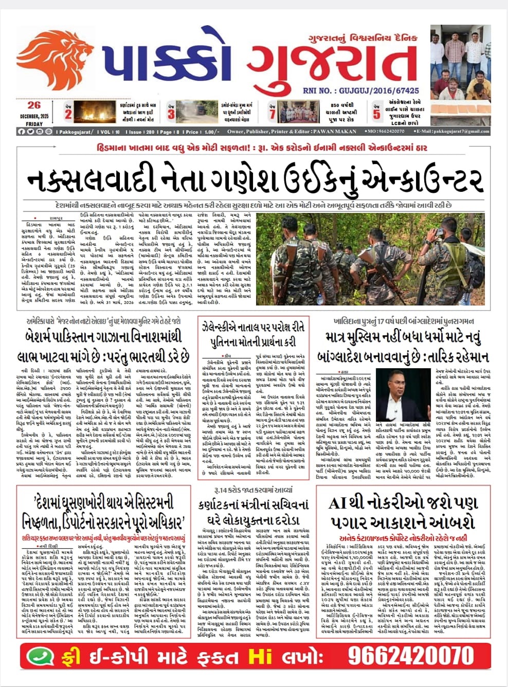 HomeepaperPAKKO GUJARAT : 26-12-2025 PAKKO GUJARAT : 26-12-2025 By pakkogujarat December 26, 2025 0 634 Share FacebookTwitterPinterestWhatsApp PAKKO_GUJARAT_26-12-2025Download Share FacebookTwitterPinterestWhatsApp Previous articleRashi : 26 ડિસેમ્બર નું રાશિ ભવિષ્યNext articlePorbandar : રહીજના “જય દ્વારકાધીશ પદયાત્રા મંડળ” દ્વારા રહીજથી દ્વારકા નીકળેલી ૨૦મી પદયાત્રા નું પોરબંદર ખાતે ભવ્ય સ્વાગત pakkogujarathttps://pakkogujarat.com/ RELATED ARTICLES epaper PAKKO GUJARAT : 02-03-2026 March 2, 2026 epaper PAKKO GUJARAT : 01-03-2026 March 1, 2026 epaper PAKKO GUJARAT : 28-02-2026 February 28, 2026 LEAVE A REPLY Cancel reply Comment: Please enter your comment! Name:* Please enter your name here Email:* You have entered an incorrect email address! Please enter your email address here Website: Save my name, email, and website in this browser for the next time I comment. - Advertisment - Most Popular Entertainment : ‘મારે ઘરે જવું છે…’, યુદ્ધ વચ્ચે અબુ ધાબીમાં ફસાઈ બોલિવૂડ એક્ટ્રેસ, UAE સરકારના કર્યા વખાણ March 2, 2026 Valsad : વાપીમાં રીક્ષામાંથી 13.730 કિલોગ્રામ ગાંજાનો જથ્થો પકડાયો : પાંચની ધરપકડ, બે વોન્ટેડ March 2, 2026 National : ખામેનેઈના મોત મુદ્દે જમ્મુ-કાશ્મીરમાં હિંસક દેખાવો, ટોળાને વિખેરવા લાઠીચાર્જ, ટિયર ગેસના શેલ છોડ્યા March 2, 2026 Delhi : ઈરાન-અમેરિકા યુદ્ધની અસરને પગલે અમેરિકન દૂતાવાસ ખાતે સુરક્ષા વધારી દેવાઈ, ચુસ્ત બંદોબસ્ત ગોઠવાયો March 2, 2026 Load more Recent Comments